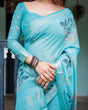 Aqua Blue Pure Cotton Linen Saree with Floral Design, Blouse, and Tassel Detailing
