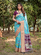 Aqua Blue Tussar Silk Saree with Floral Vine Design and Gold Zari Border
