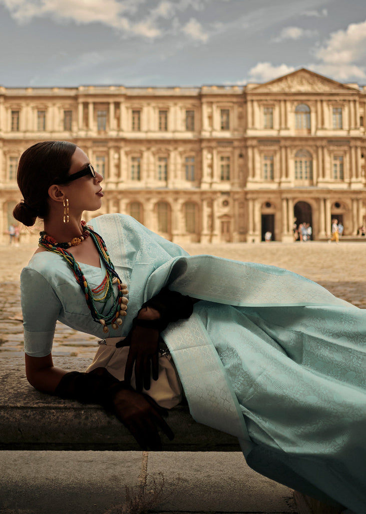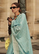 Baby Blue Elegant Satin Silk Blend Saree with Matching Blended Silk Blouse Piece