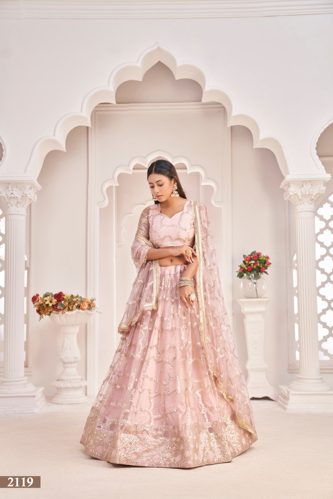 Baby Pink Butterfly Net Lehenga, perfect for any festive or special occasion. Crafted from premium butterfly net fabric, this lehenga features exquisite zari work and sandwich sequence embroidery, complemented by a readymade fancy lace border for a luxurious touch.