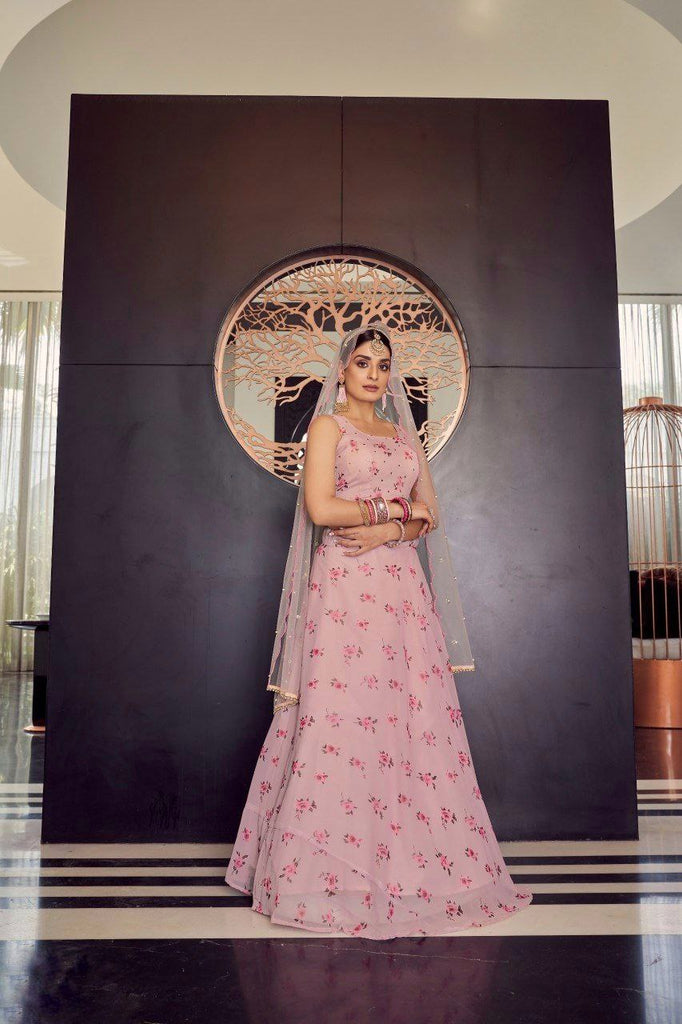 Baby Pink Floral Digital Printed Georgette Lehenga Set with Sequins Net Dupatta – Semi-Stitched Lehenga & Unstitched Blouse