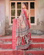 Celebrate heritage with this exquisite beige Tussar silk saree, adorned with intricate traditional motifs depicting regal and cultural themes in striking red accents. The saree features a luxurious red zari border with ornate paisley and floral patterns, adding an element of grandeur. The pallu is a masterpiece of craftsmanship, showcasing bold depictions of traditional figures and intricate designs, symbolizing timeless artistry. Perfect for weddings, festive occasions, and cultural gatherings, this saree combines tradition and elegance, making it a must-have for your ethnic collection. Finished with tassel detailing, it exudes sophistication and charm.
