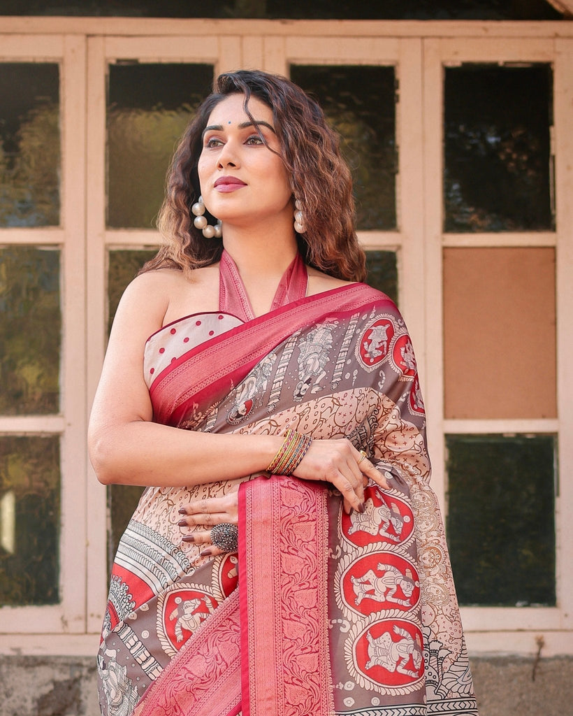 Celebrate heritage with this exquisite beige Tussar silk saree, adorned with intricate traditional motifs depicting regal and cultural themes in striking red accents. The saree features a luxurious red zari border with ornate paisley and floral patterns, adding an element of grandeur. The pallu is a masterpiece of craftsmanship, showcasing bold depictions of traditional figures and intricate designs, symbolizing timeless artistry. Perfect for weddings, festive occasions, and cultural gatherings, this saree combines tradition and elegance, making it a must-have for your ethnic collection. Finished with tassel detailing, it exudes sophistication and charm.