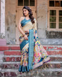Beige & Teal Tussar Silk Saree with Intricate Kalamkari and Zari Border