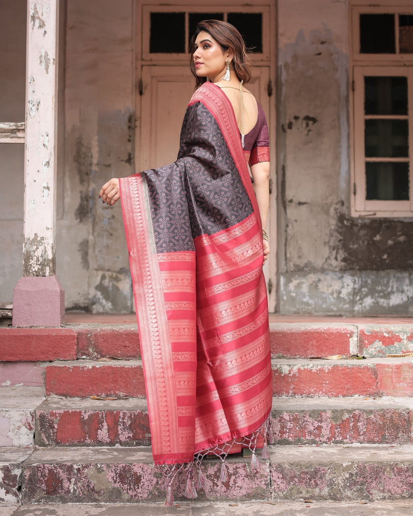 Channel elegance and sophistication with this striking black Banarasi silk saree, adorned with intricate traditional motifs in a contemporary design. The vibrant pink zari-woven border adds a bold yet graceful touch, perfectly complementing the dark base. The pallu continues the detailed zari craftsmanship, making it an ideal choice for weddings, festive celebrations, or formal gatherings. Crafted from premium Banarasi silk, this saree ensures both comfort and style. Pair it with gold or pearl jewelry for a timeless look that will leave an unforgettable impression.