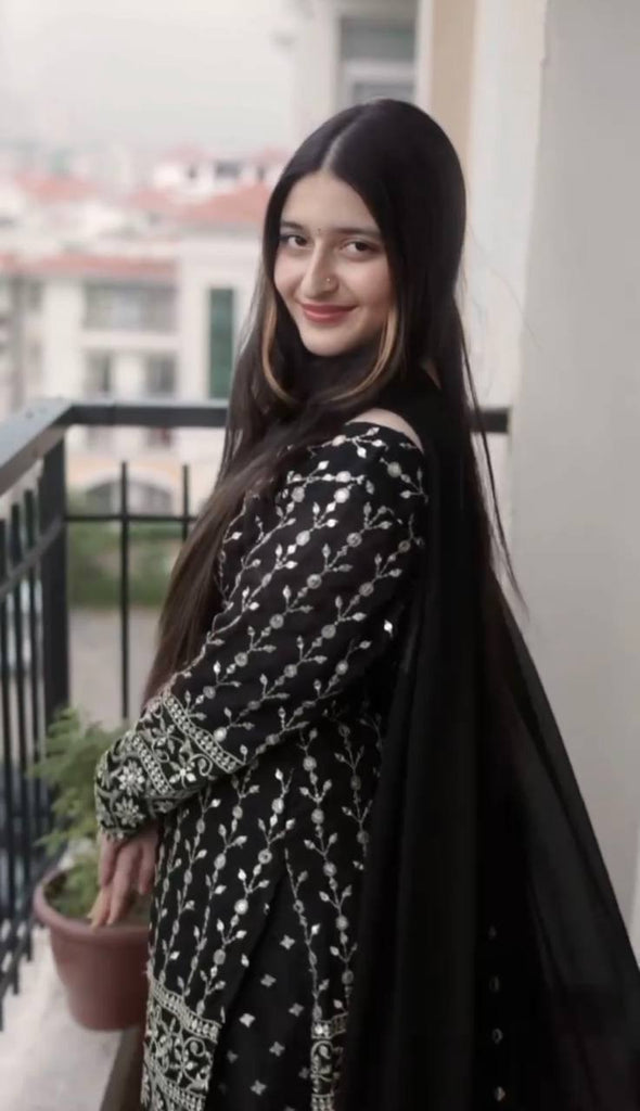 Designer Suit, a luxurious creation crafted for women who desire premium quality and exquisite detailing. Made from Faux Blooming fabric and adorned with 5mm sequins embroidery work, this set delivers a perfect balance of glamour and sophistication.