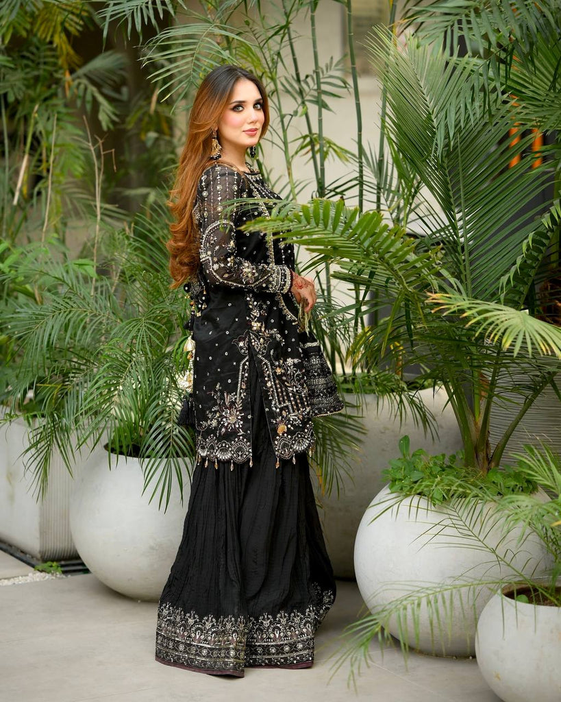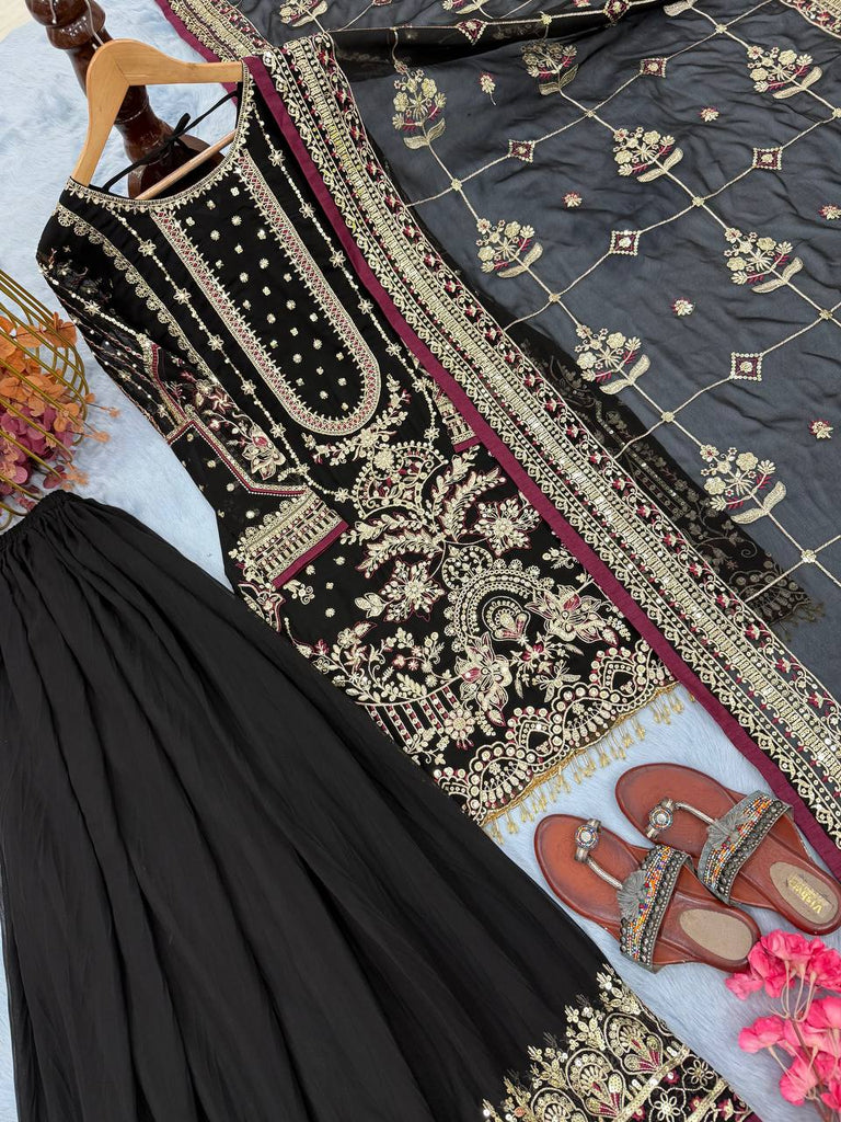 Black Designer Faux Georgette Embroidered Top with Khajuri Crush Palazzo & Matching Dupatta Set