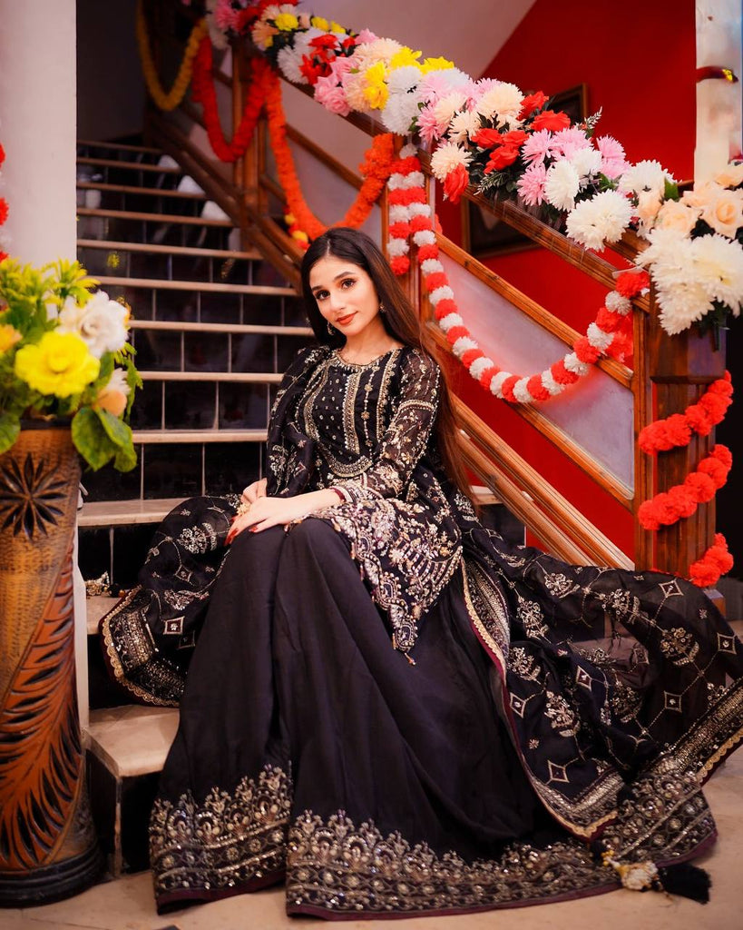 • Work: Heavy Embroidery with 5mm Sequin Work & Rivet Moti Detailing, Sleeves with Fancy Latkan Border