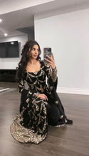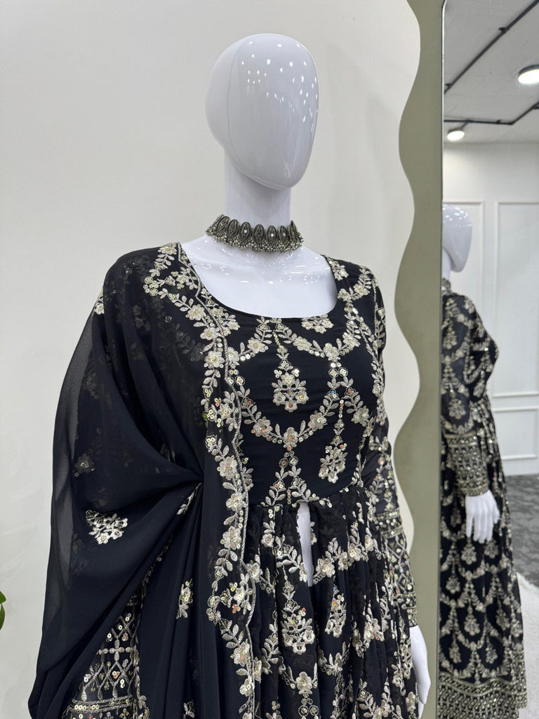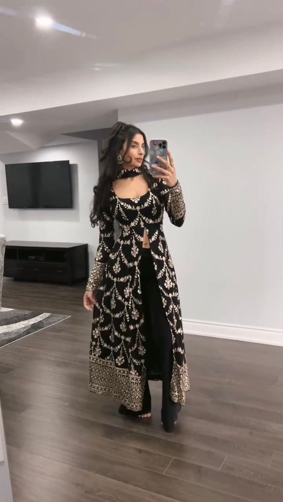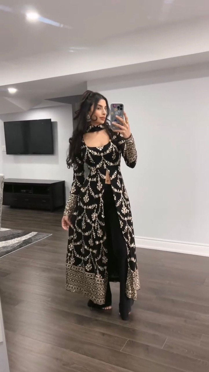 Black Elegant Faux Georgette Embroidered Suit with Micro Cotton Pant