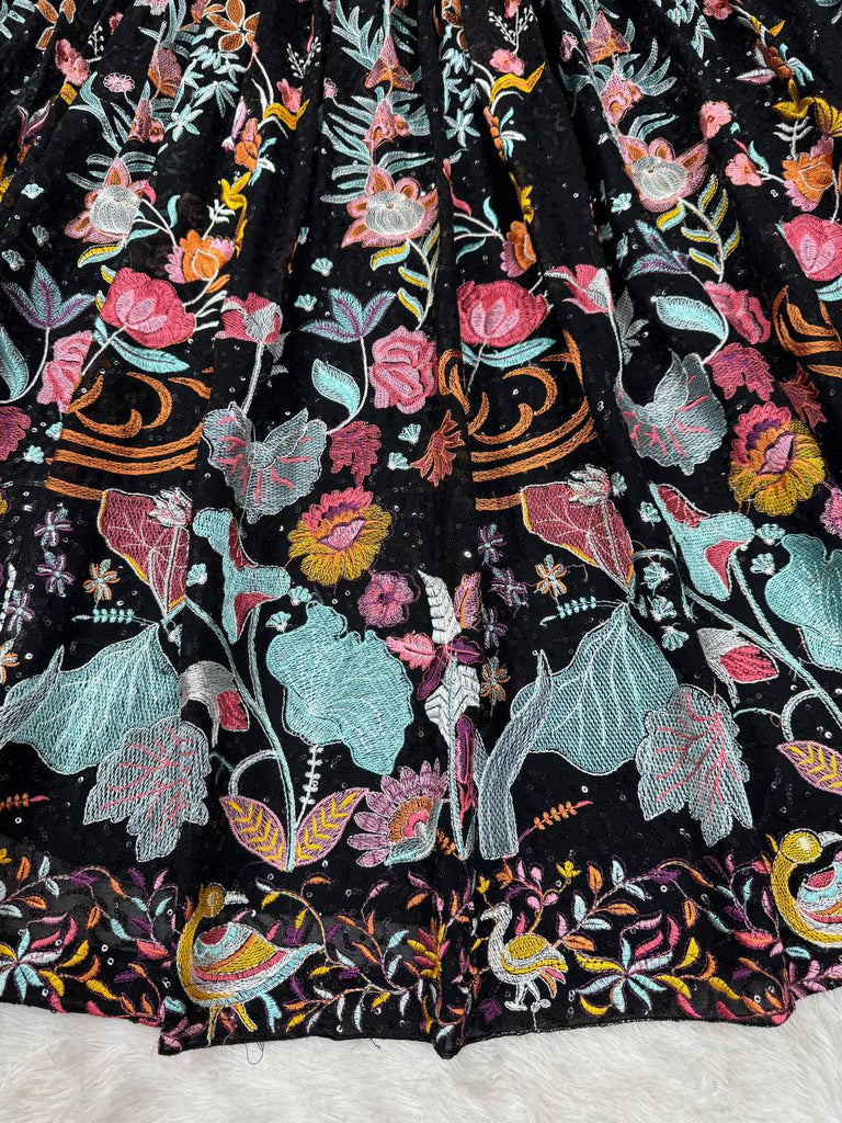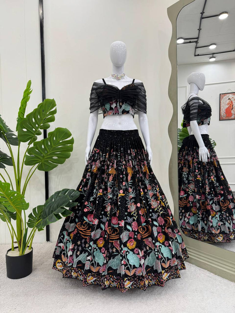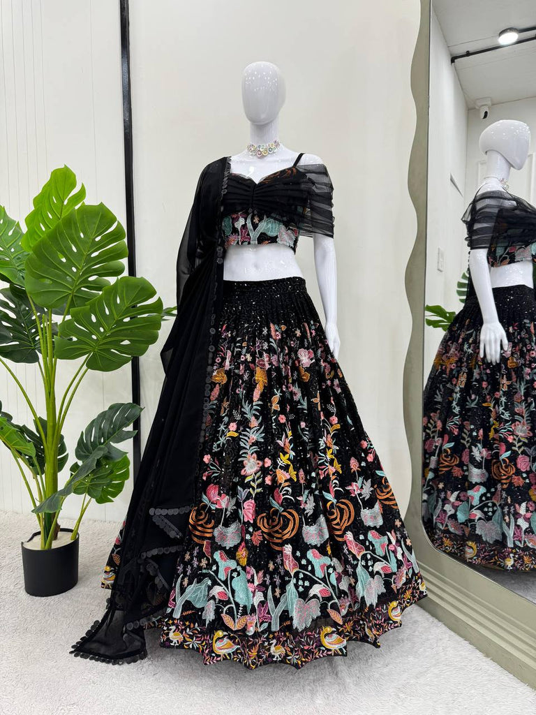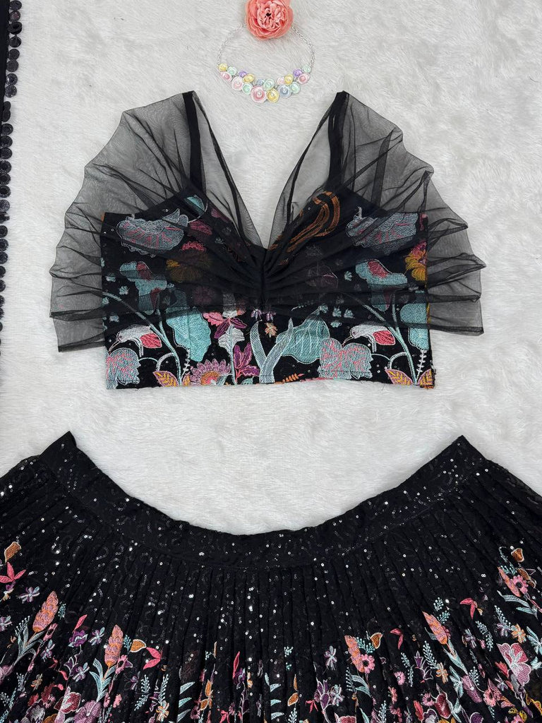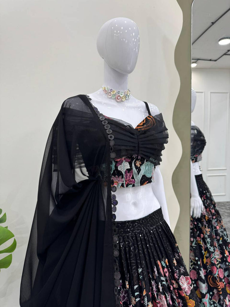 Black Elegant Faux Georgette Semi-Stitched Lehenga Set with Thread & Sequin Work