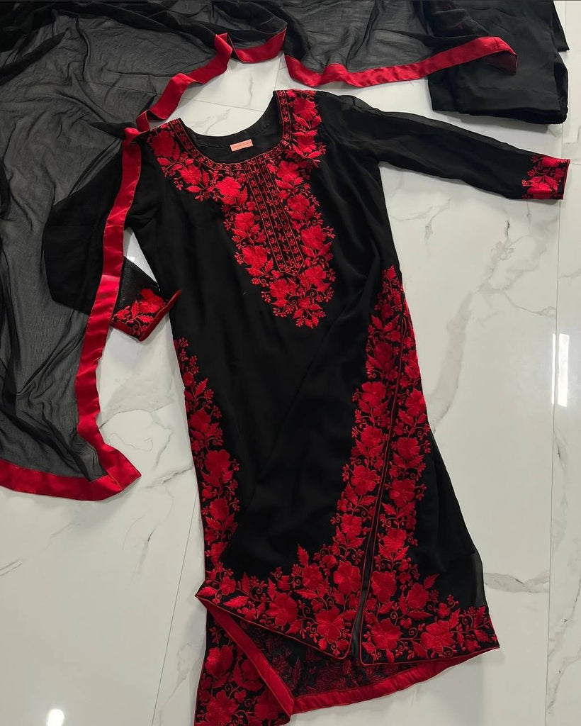 Black Elegant Heavy Faux Georgette Embroidered Top with Plazzo & Dupatta – Fully Stitched, Comfortable Fit