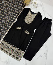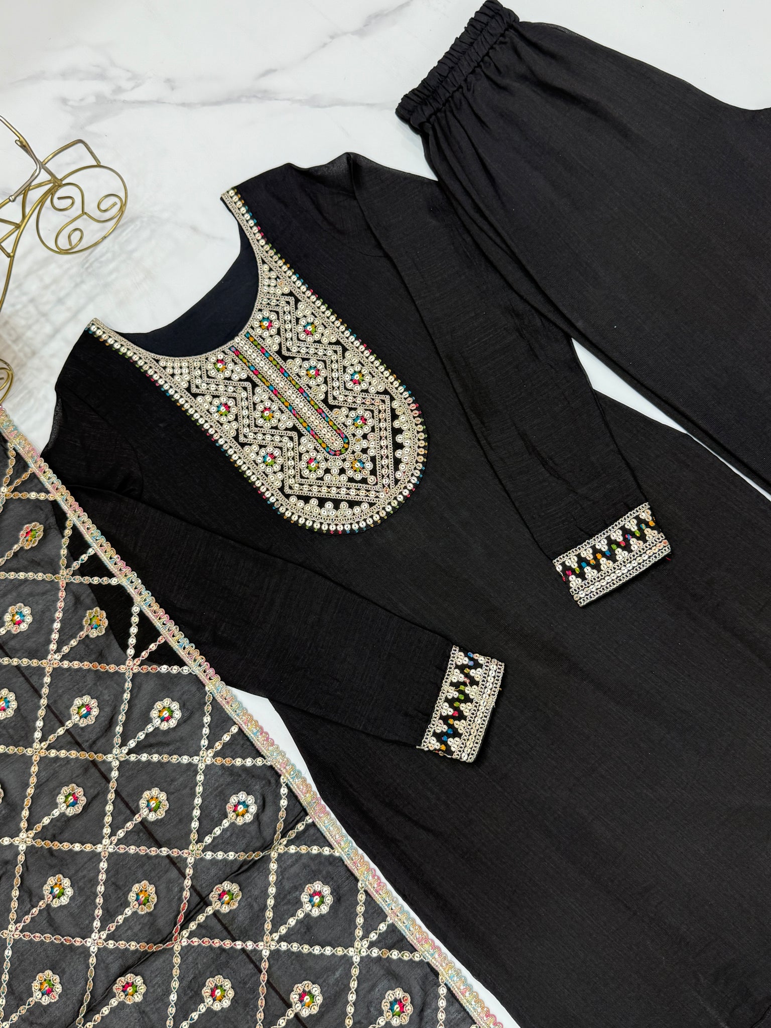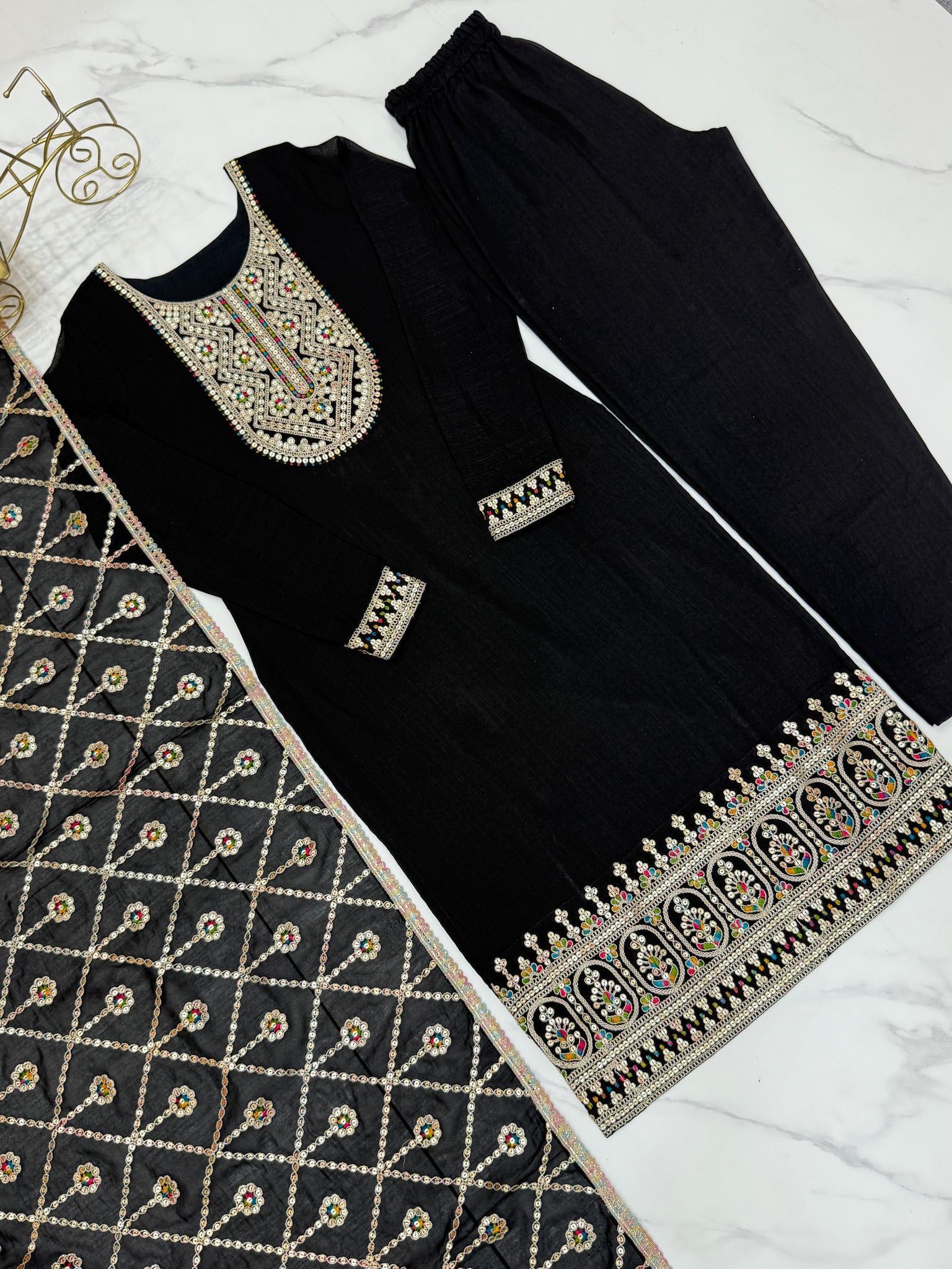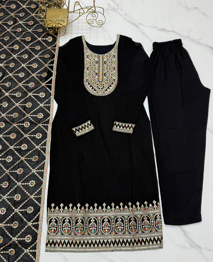 Black Elegant Pure Vichitra Silk Embroidered Kurta with Dupatta & Trousers – Ready to Wear Set