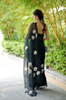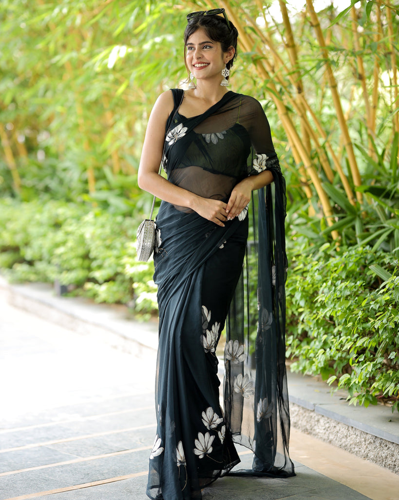 Black Georgette Saree with Hand-Painted White Florals – Attached Blouse – 5.5 Meters