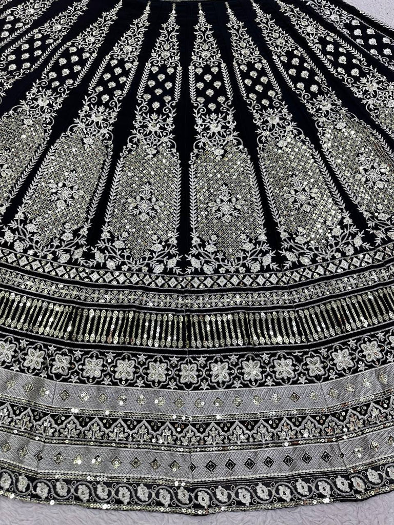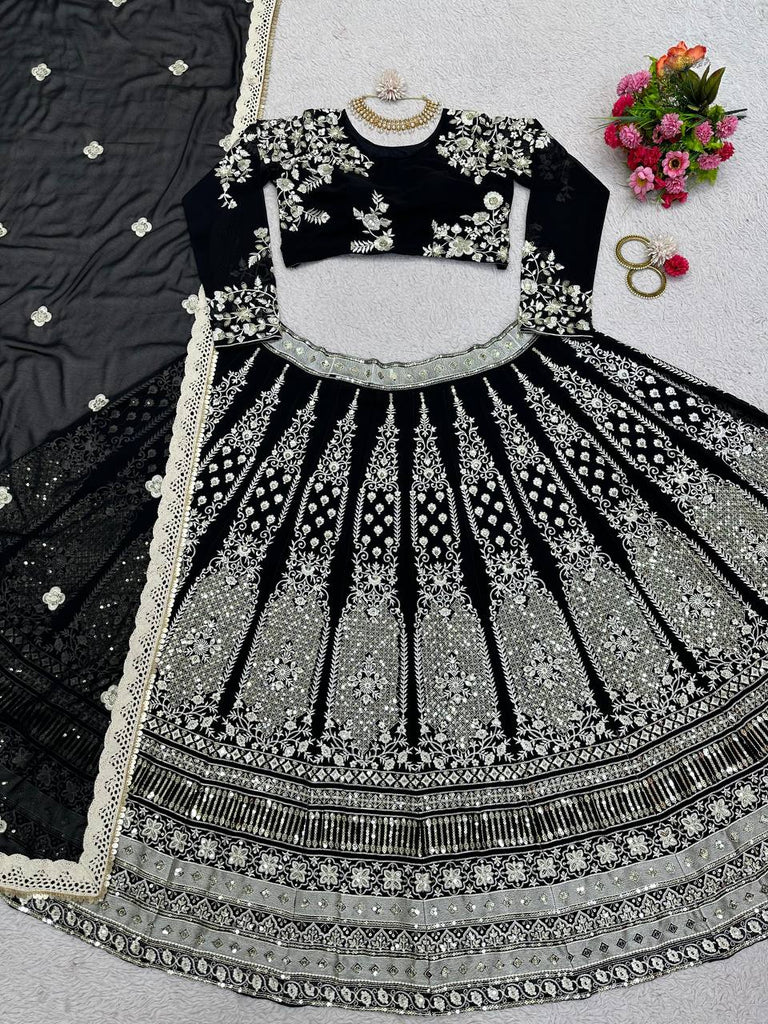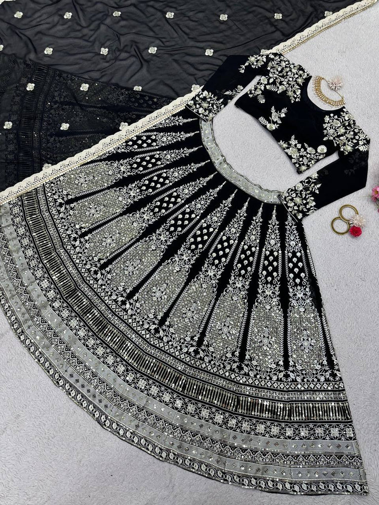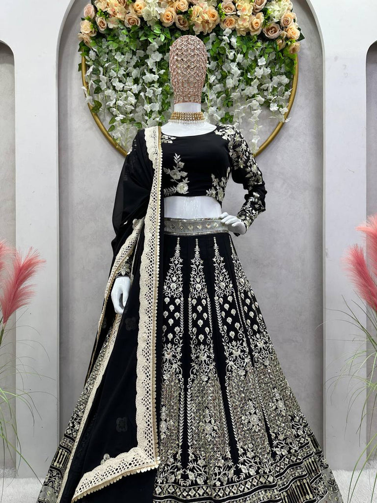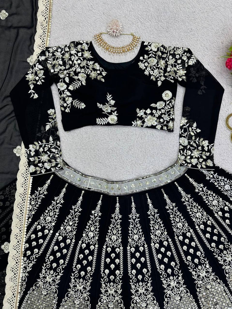 Black Glam Fox Georgette Sequin Embroidered Lehenga Set with Four-Side Lace Dupatta