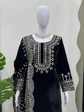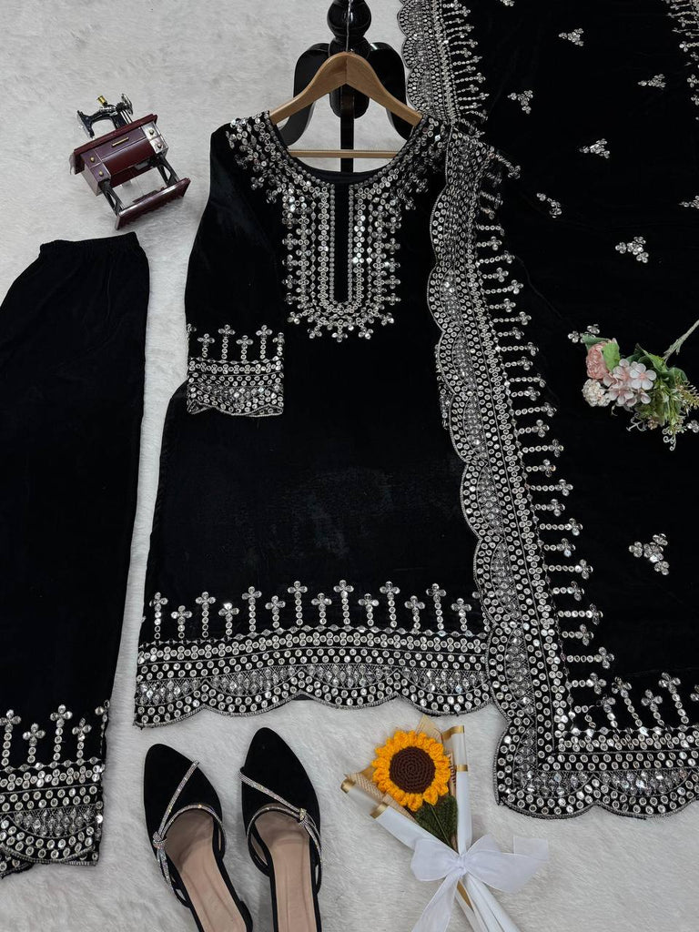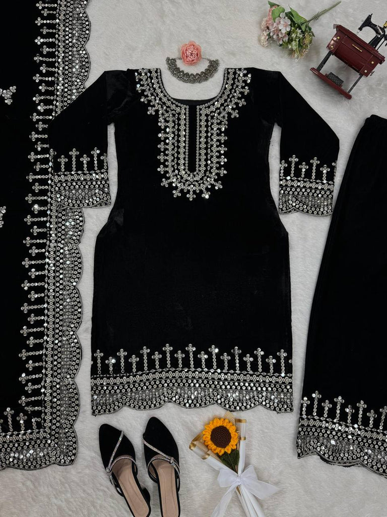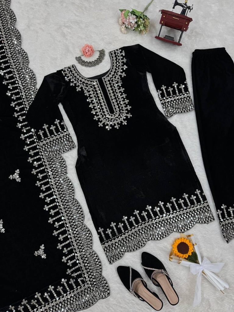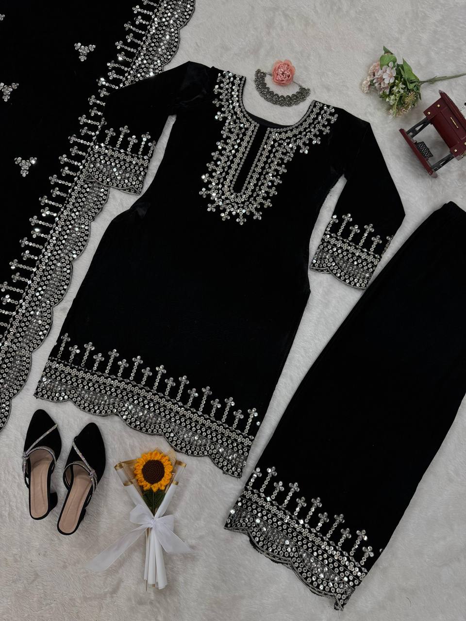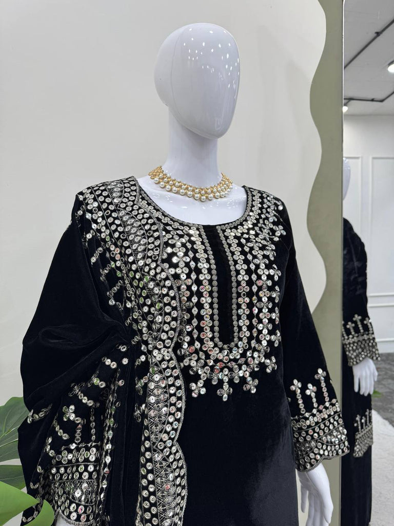 Black Luxurious Viscose Velvet Plazo Set with Embroidered Dupatta