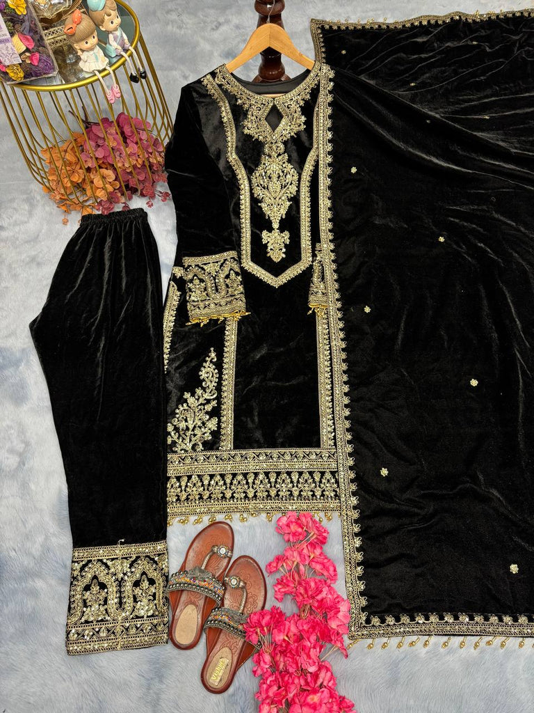 Black Premium Designer Readymade Viscose Velvet Top, Plazzo & Dupatta Set – Party Wear Elegance