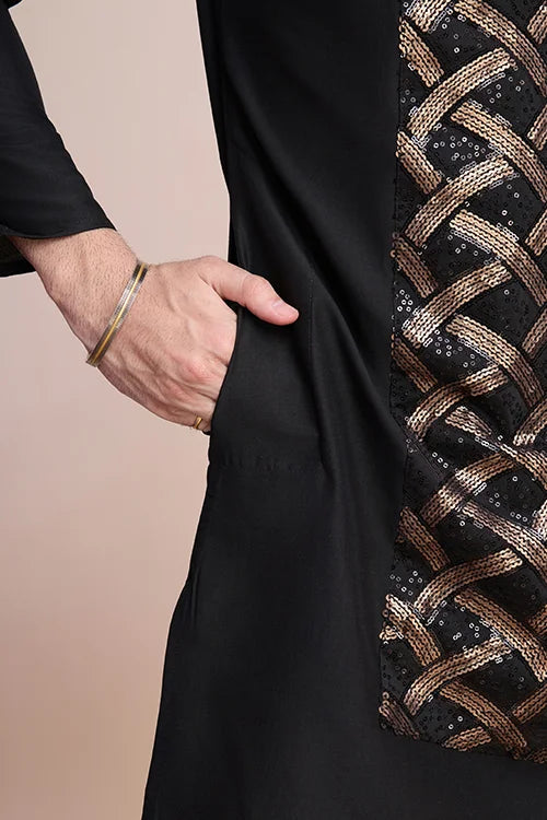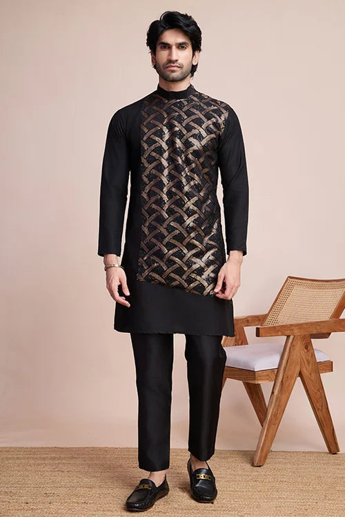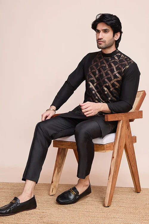 Black Silk Embroidered Work Designer Men's Wear Kurta