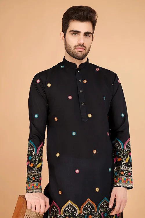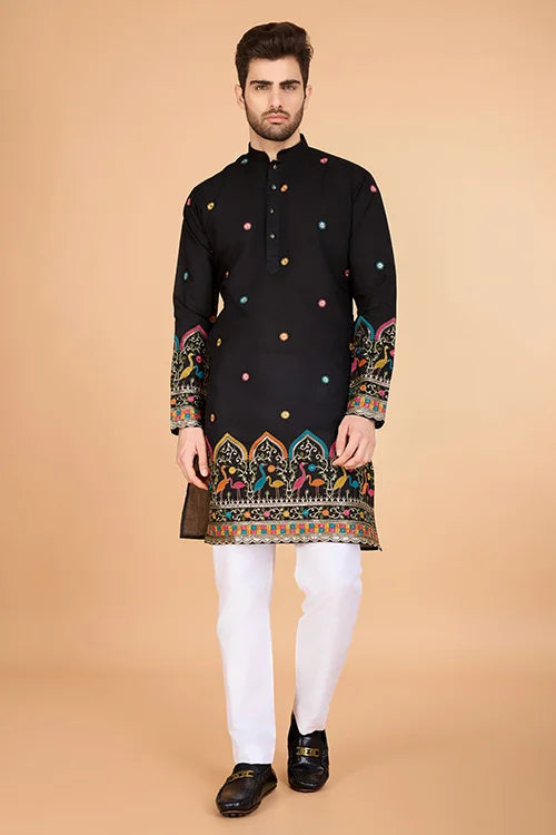 The Black Men's Kurta with Thread Work by Offering a Modern Silhouette That Complements Various Body Types. the Thread and Sequence Work on the Kurta’s Neckline and Sleeves Further Elevate Its Look, Ensuring You Exude Charm and Wherever You Go.
