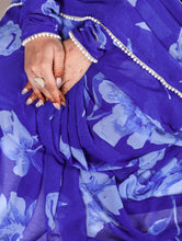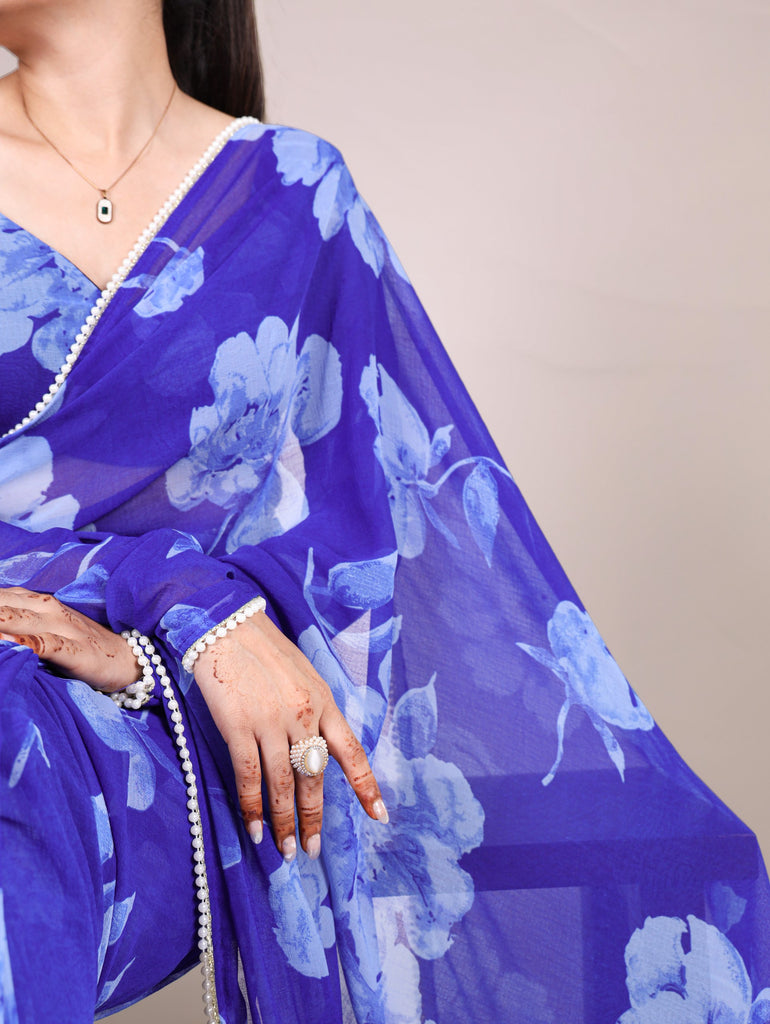 Blue Delicate Blooms Chiffon Saree with Floral Print and Pearl Lace Border
