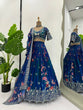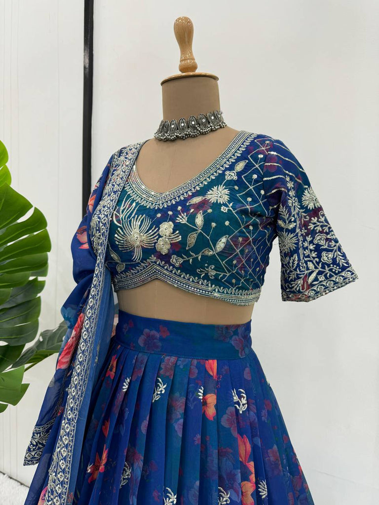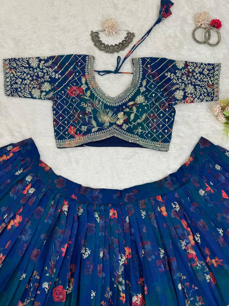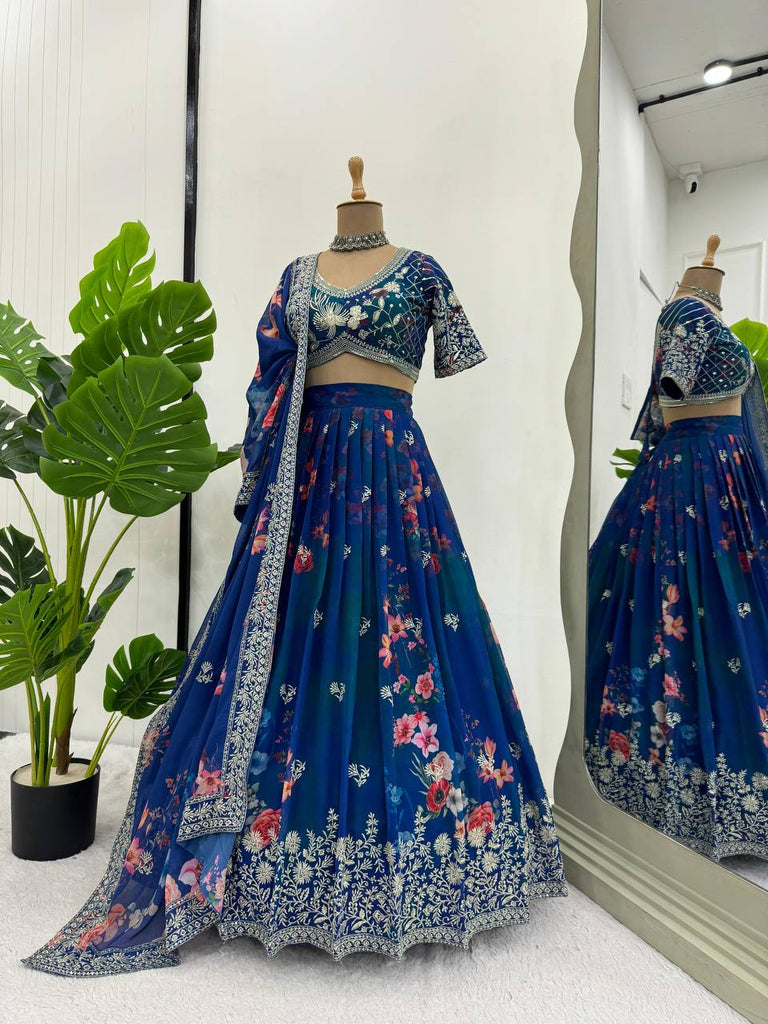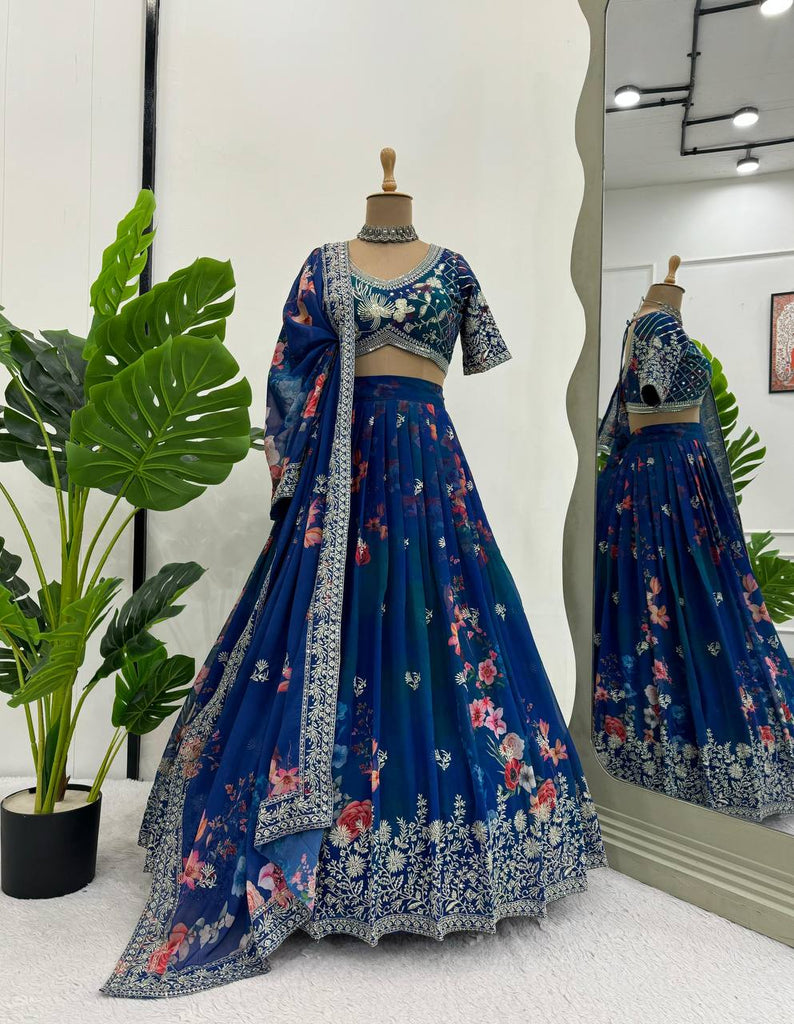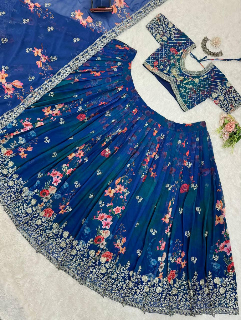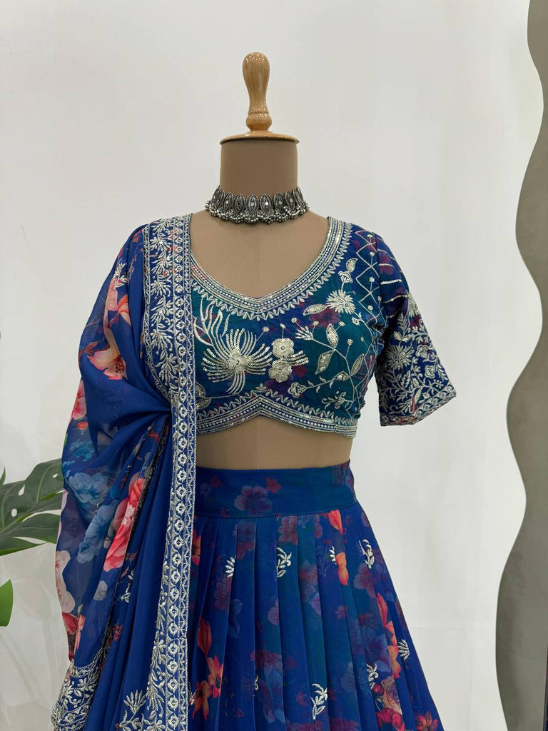 Blue Designer Faux Georgette Digital Print Lehenga Set with Thread & Sequin Embroidery