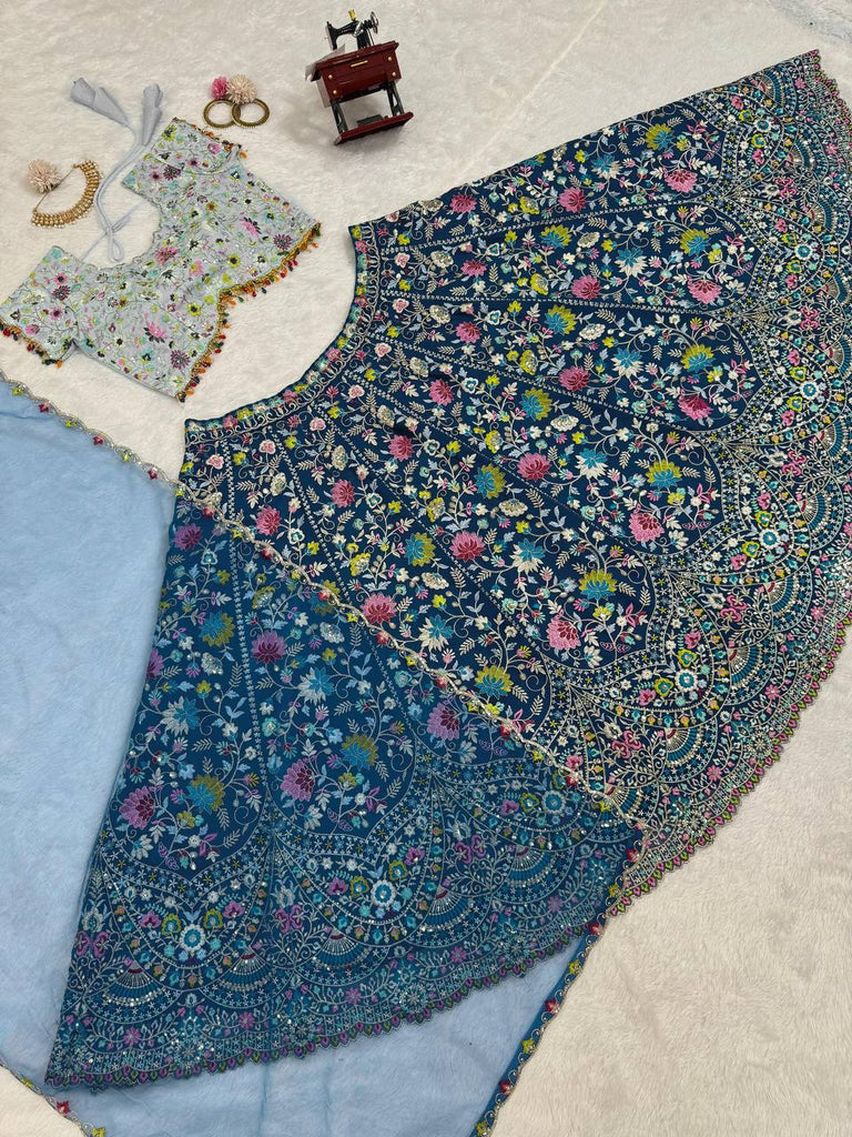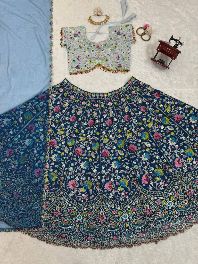 Blue Designer Faux Georgette Semi-Stitched Lehenga Choli Set with Sequin Embroidery & Fancy Latkan Work