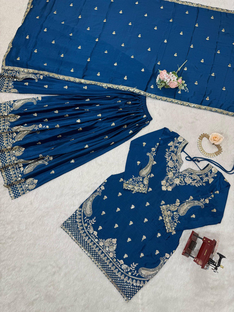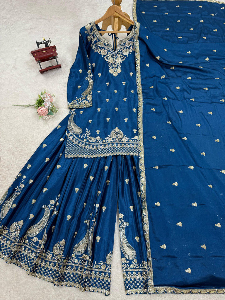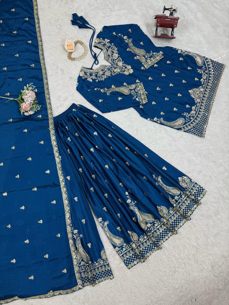 Blue Elegant Chinon Silk 3-Piece Suit Set with Sequin Embroidery & Lace Border Dupatta