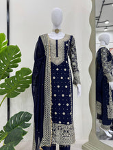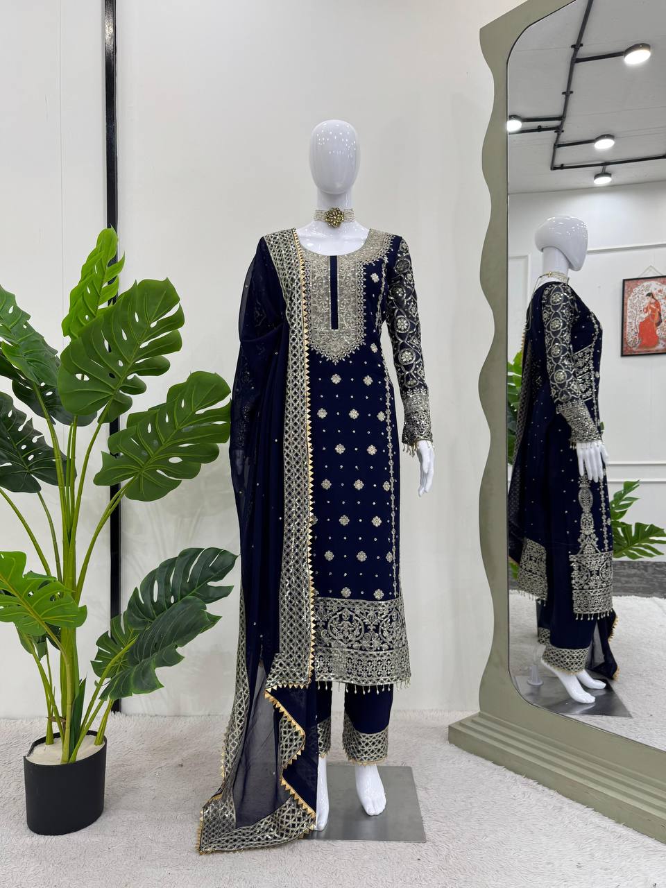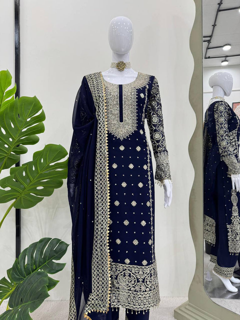 Blue Elegant Faux Georgette Thread & Sequin Embroidered Suit Set