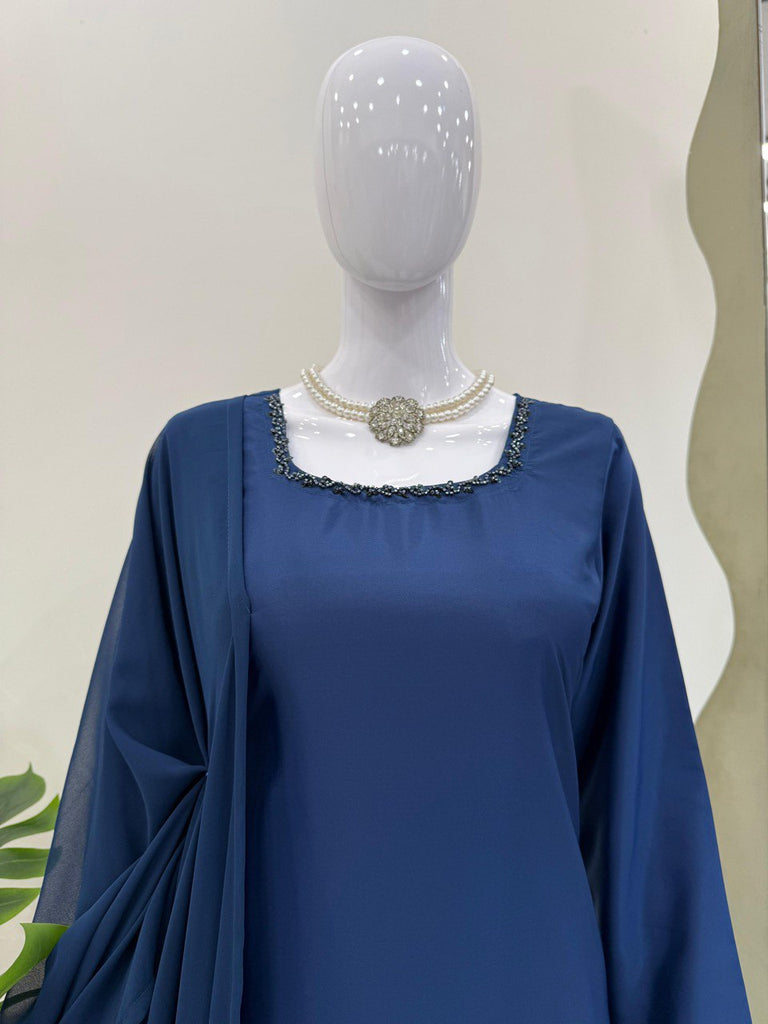 Blue Elegant Natural Crepe Farshi Set with Beaded Top & Sequins Dupatta
