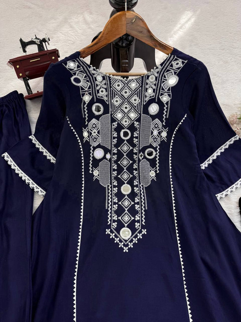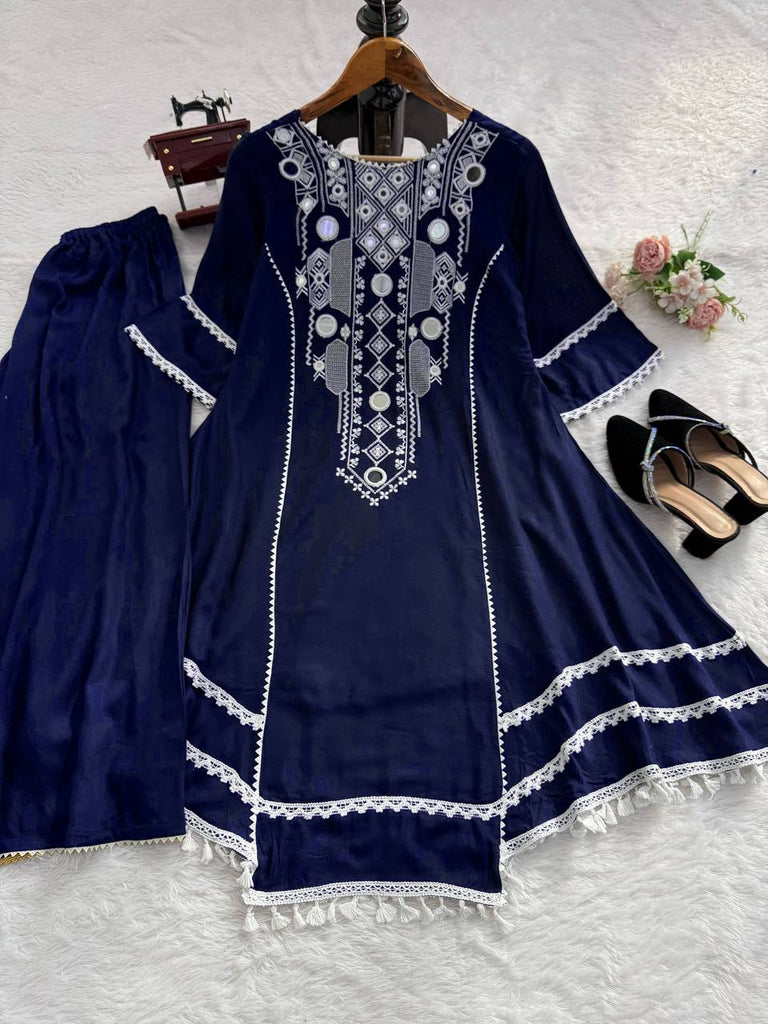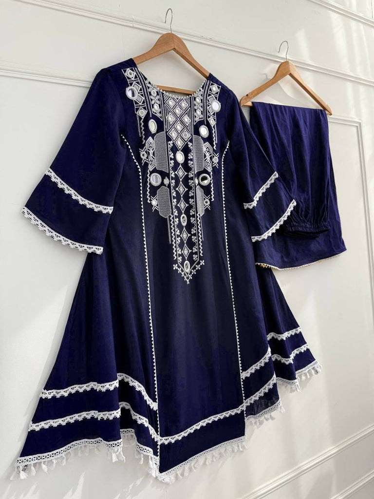 Blue Elegant Reyon Cotton Top & Plazo Set with Real Mirror Work and Fancy Lace Latkan