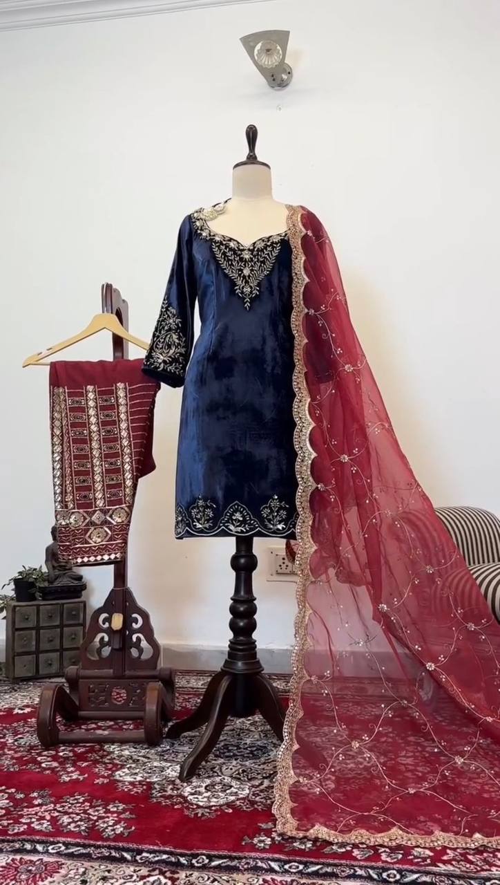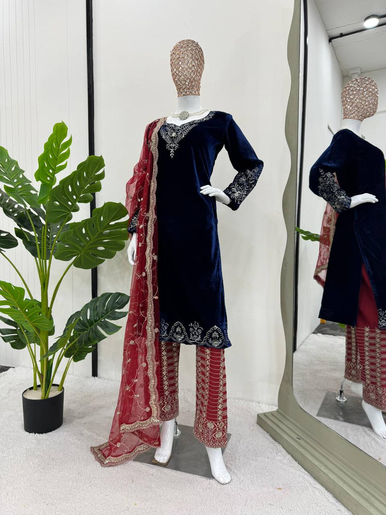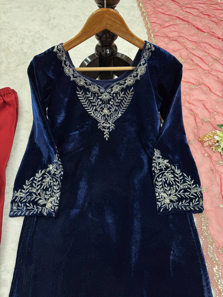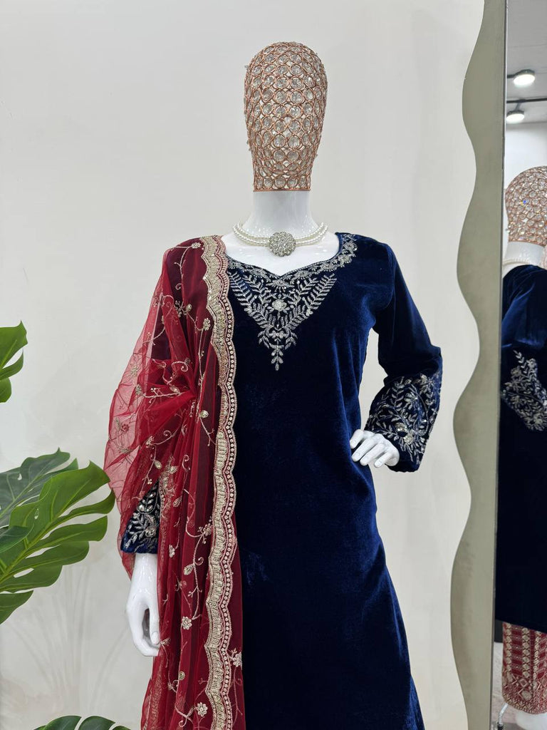 Blue Elegant Velvet Threadwork Suit Set