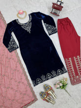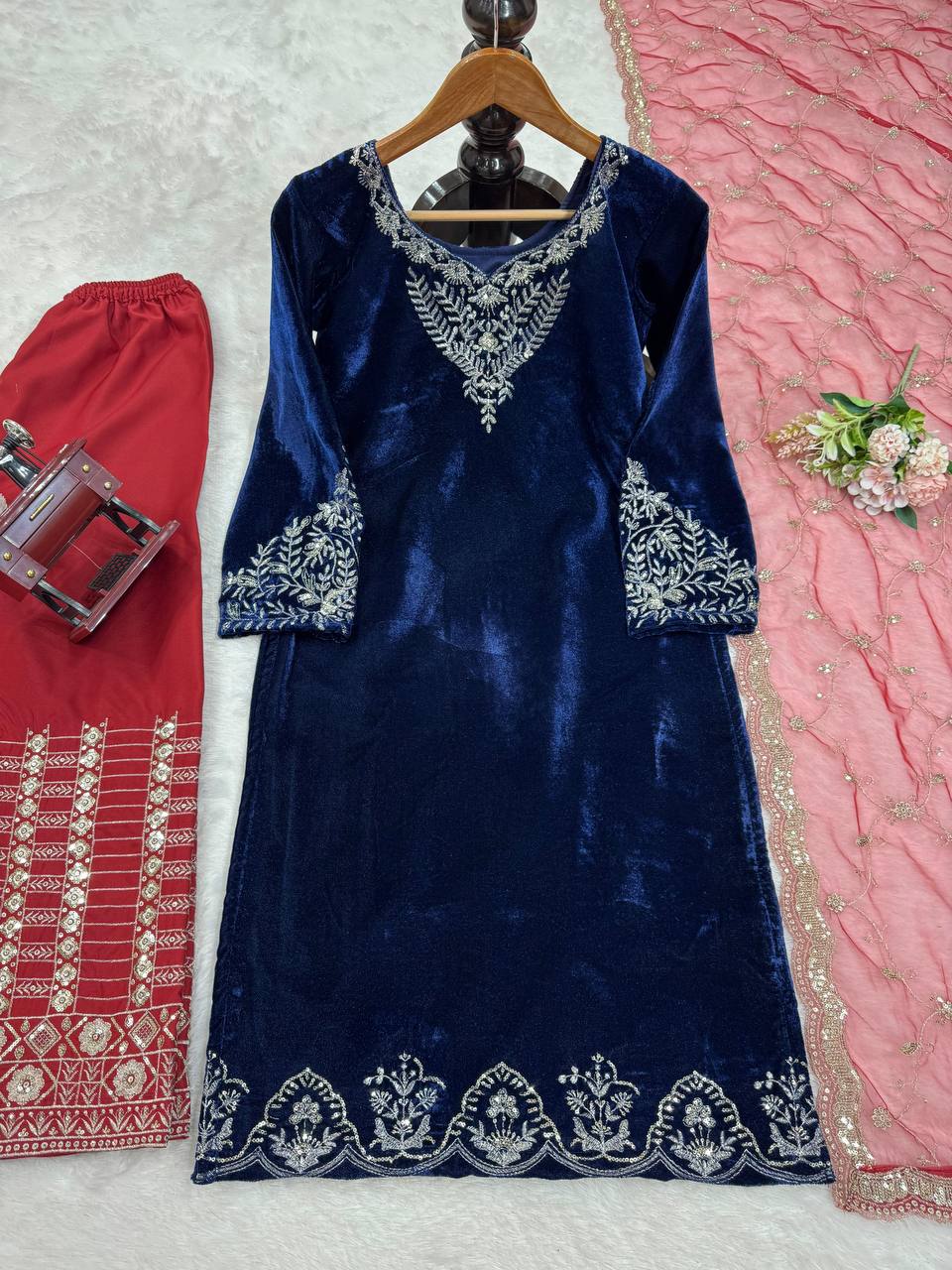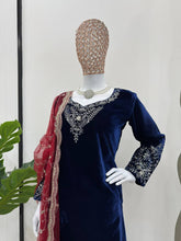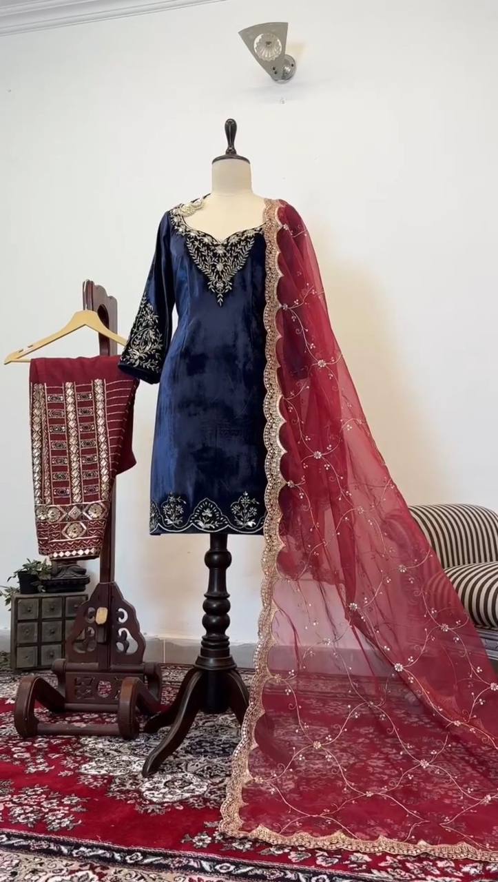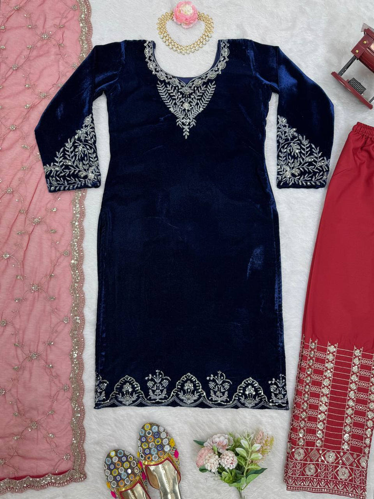 Blue Elegant Velvet Threadwork Suit Set