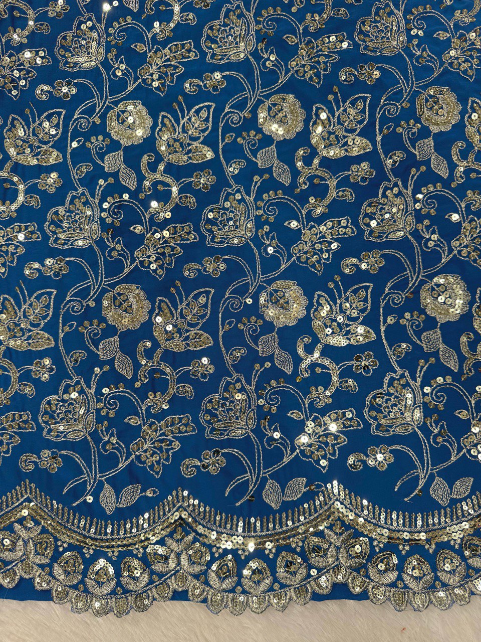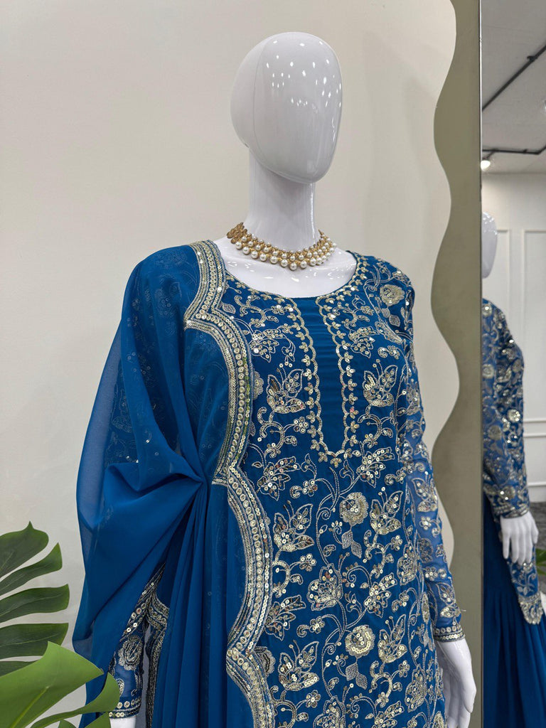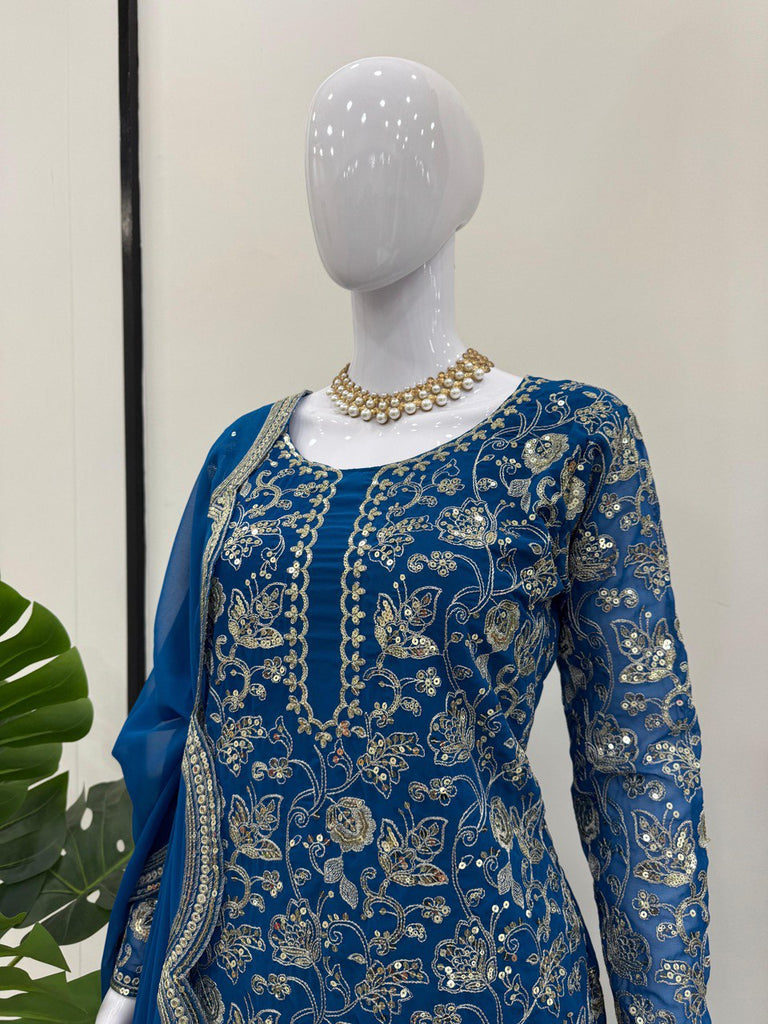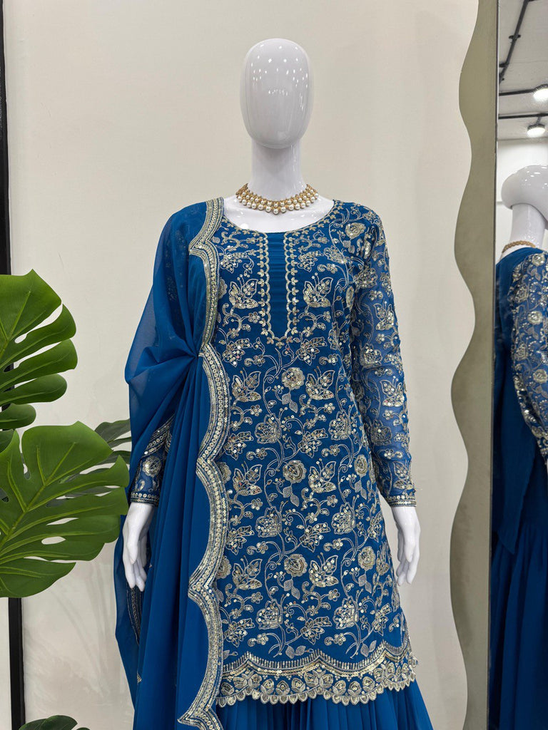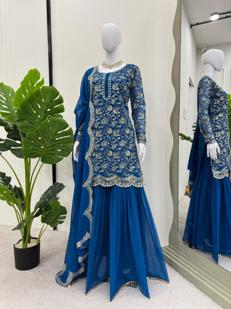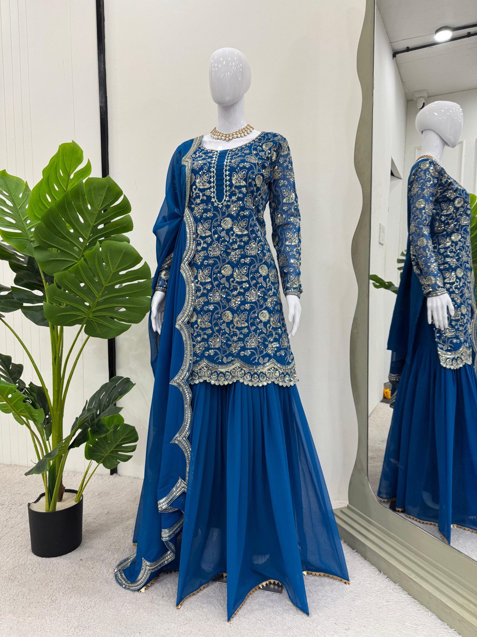 Sharara Set, designed for a graceful and sophisticated look. Made from premium Faux Georgette, this ensemble is adorned with intricate thread work and 9mm sequins, adding a touch of shimmer and elegance.