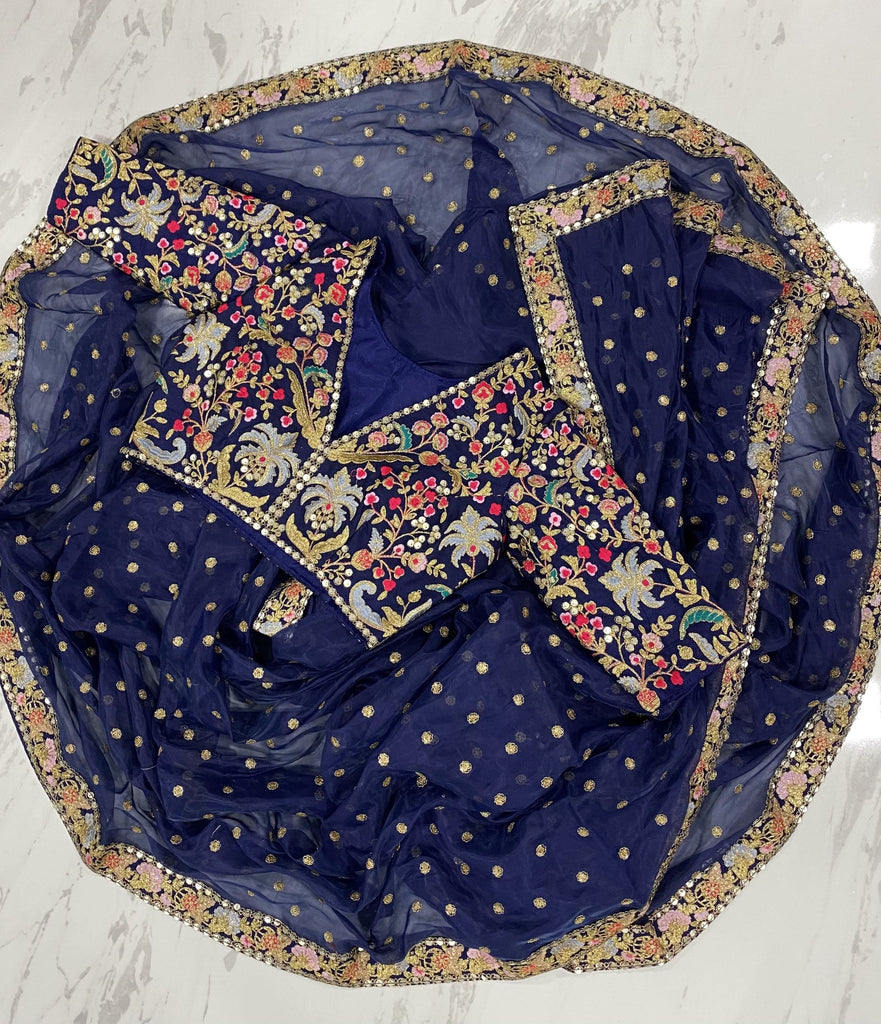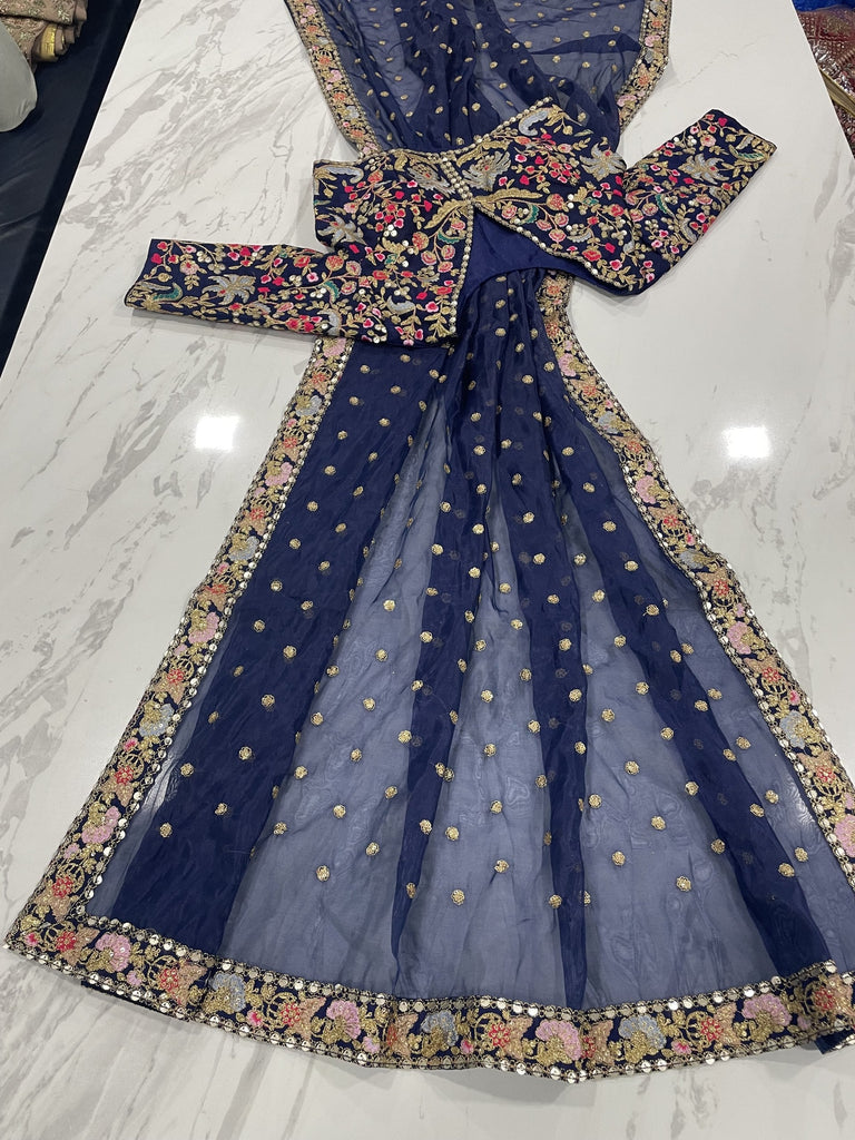 Blue Organza Saree with Zari, Thread & Sequins Work Unstitched Bangalori Silk Blouse