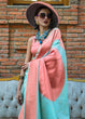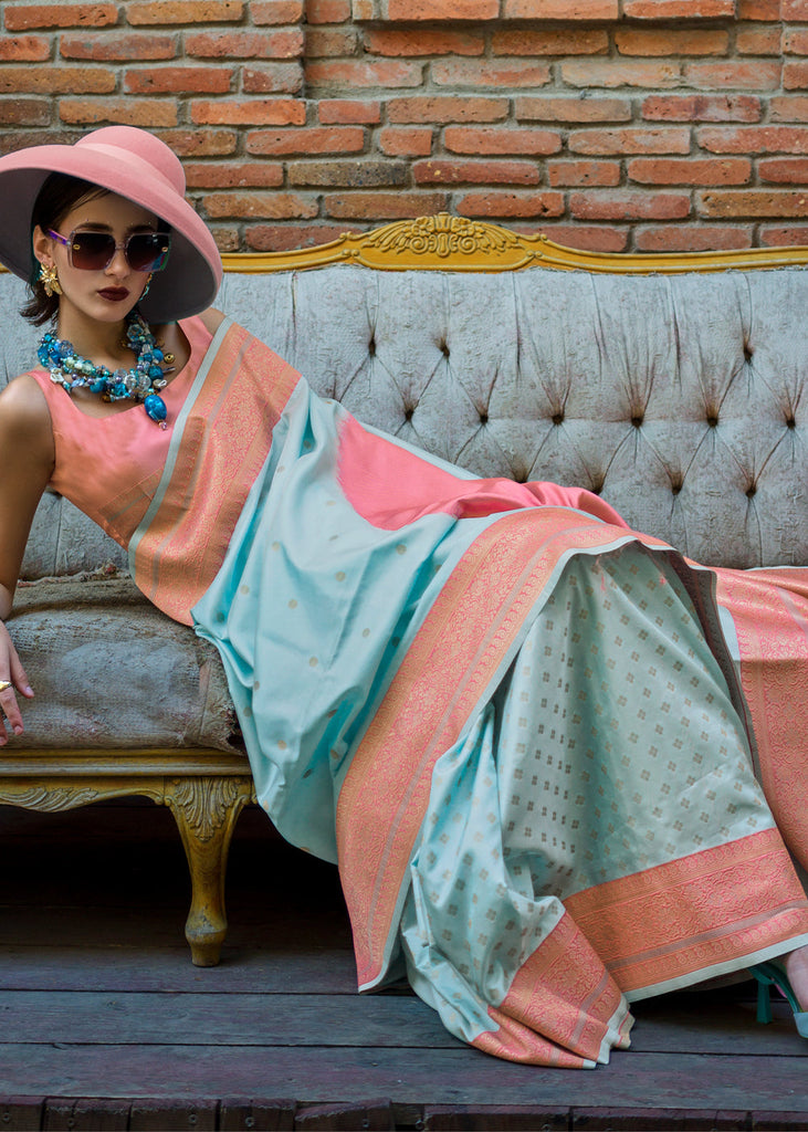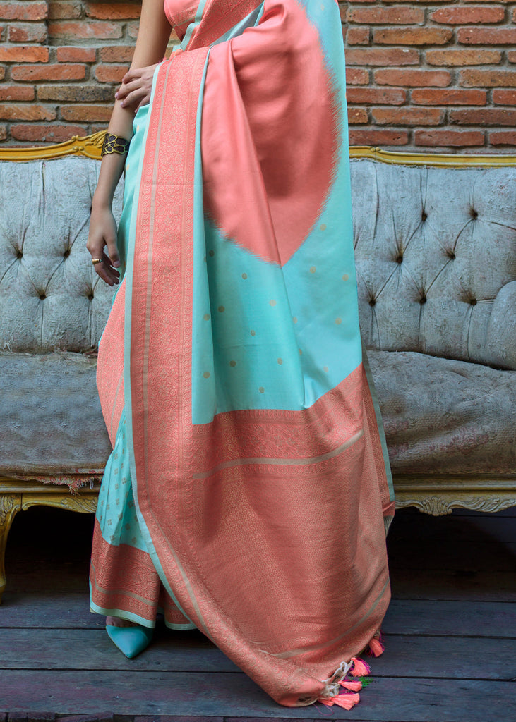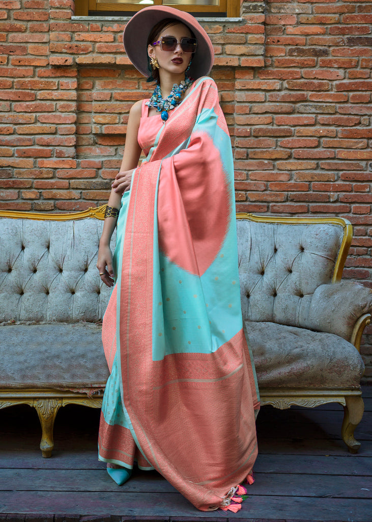 Blue & Peach Regal Banarasi Soft Silk Saree with Intricate Timeless Design & Blouse Piece