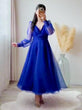 Blue Prom Dresses V-Neck Puffy Sleeves A-Line Evening Gown for Wedding