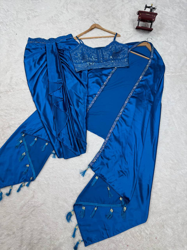 Blue Satin Silk Dhoti Style Set with Embroidered Choli & Tassel Shrug – Ready to Wear