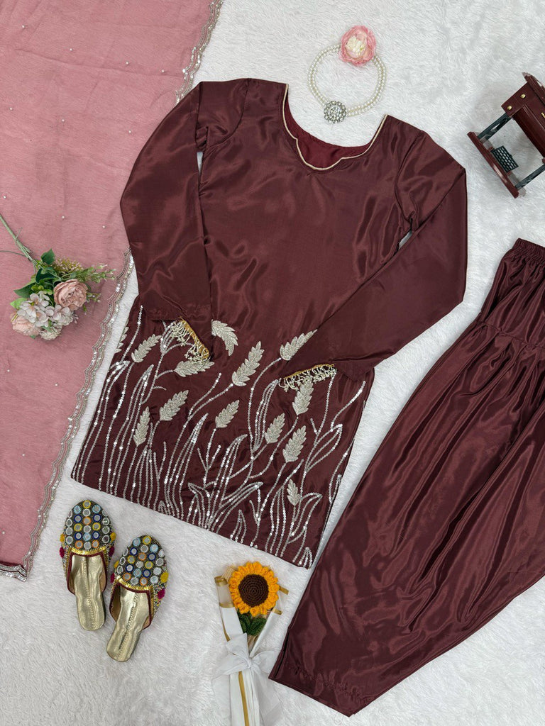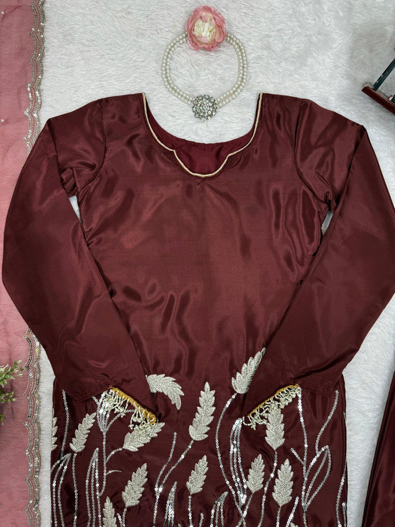 Brown Embroidered Faux Georgette Farshi Suit Set with Organza Dupatta