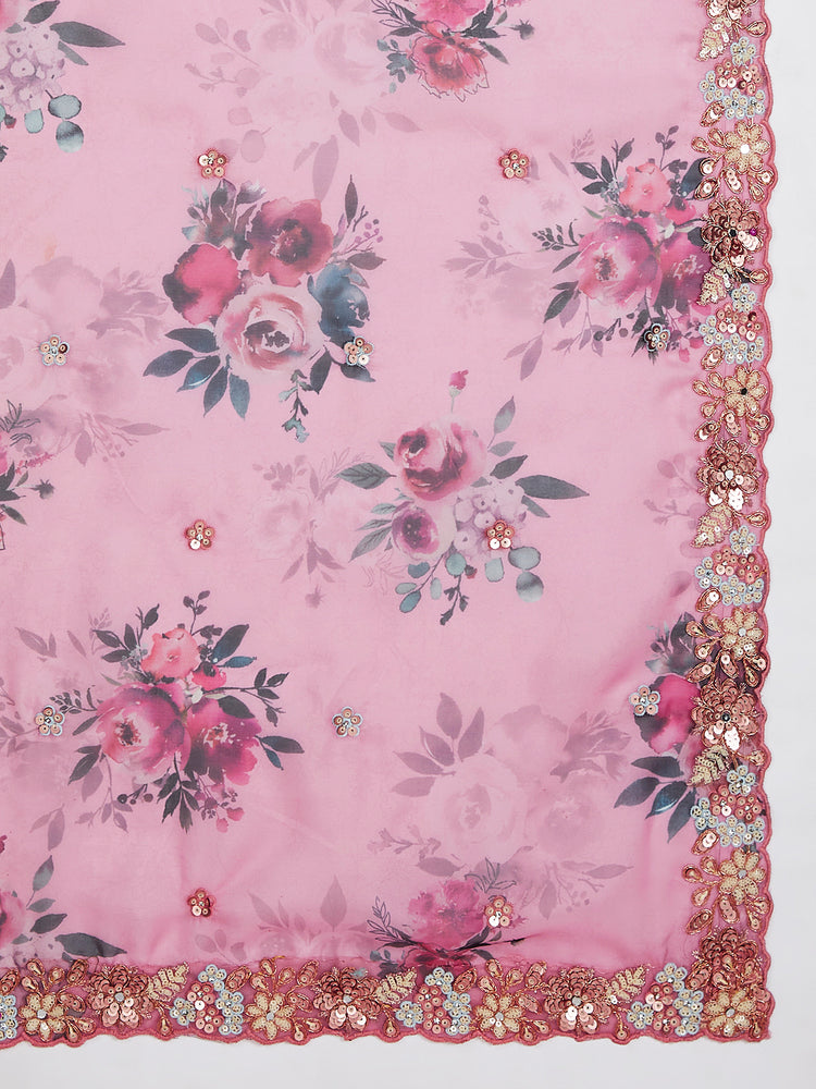 Dupatta: The contrast pink organza dupatta steals the spotlight with its vibrant floral digital print, ethnic motif sequin work, embroidered lace borders, and charming latkan tassels at the corners.