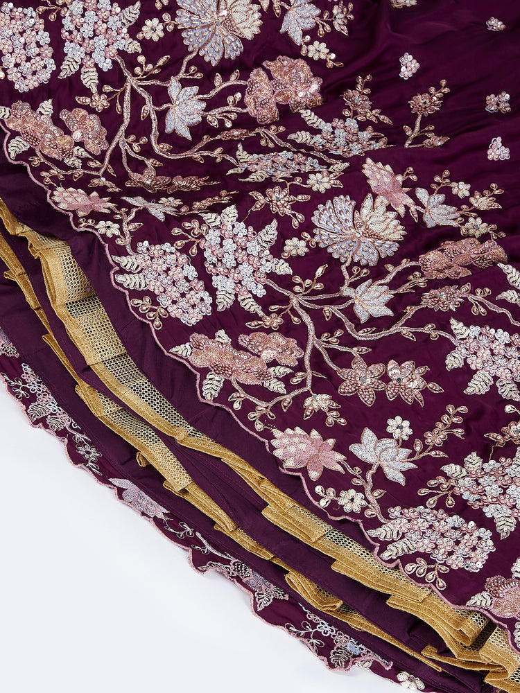Lehenga: Crafted from high-quality pure georgette in a rich burgundy shade, this full-flair lehenga features intricate heavy sequin and thread embroidery throughout. Designed with a plain hemline border for a sophisticated touch, it comes with a double shantoon inner, 17-inch can-can, and dual-layered buckram (12 & 4 inches) to give it an extraordinary volume and structure.