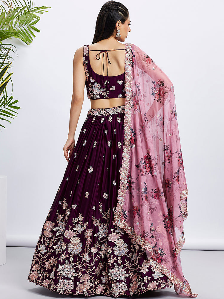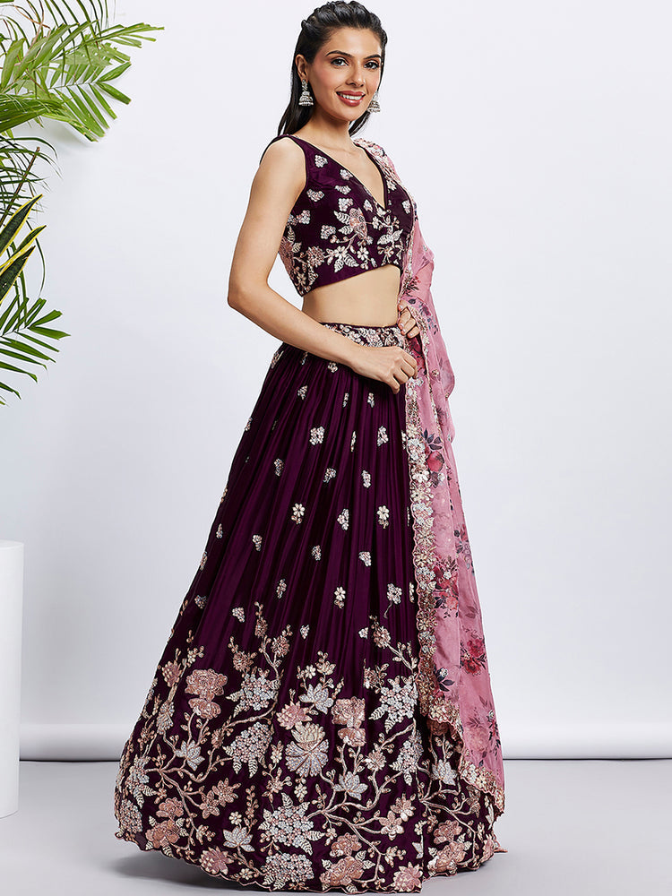 Burgundy Pure Georgette Sequins and thread embroidery Semi-Stitched Lehenga choli & Dupatta