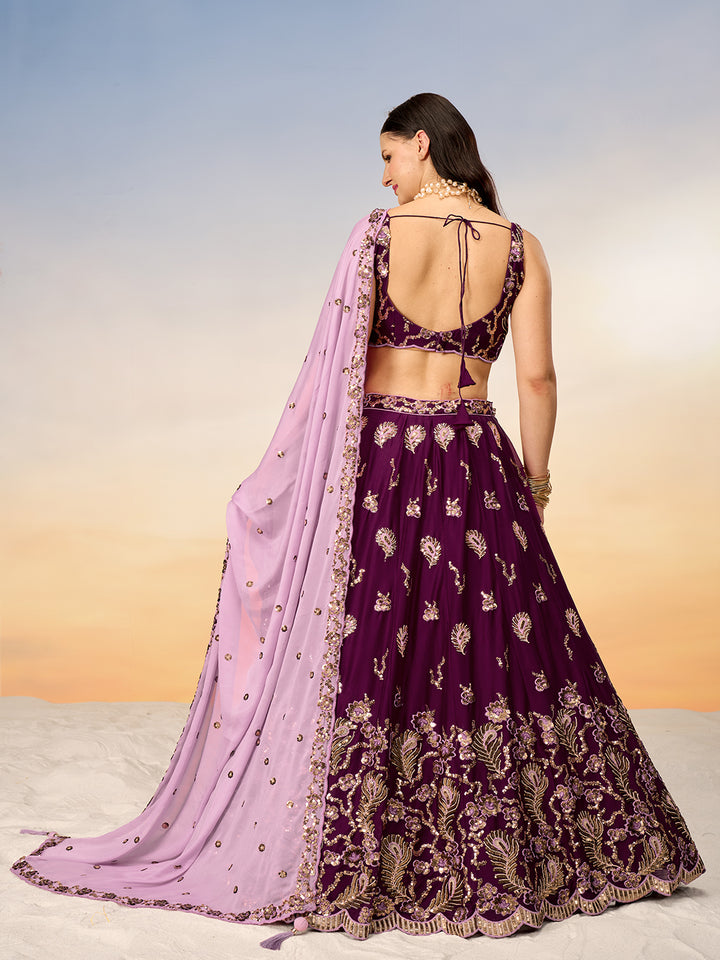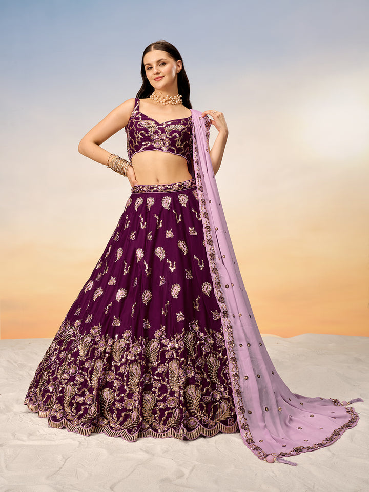 Elevate your ethnic wardrobe with this exquisitely designed Burgundy Pure Georgette Lehenga Set, beautifully paired with a soft lavender dupatta and intricate detailing that speaks elegance in every thread.