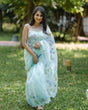 Organza is a popular fabric choice when it comes to dressing up for special occasions. Its light and floaty texture make it perfect for sarees, lehengas, and other traditional attire. The Cloudy Blue Saree in Organza Hand Painted Foil Floral is a perfect example of how organza can be used to create unique and beautiful attire.