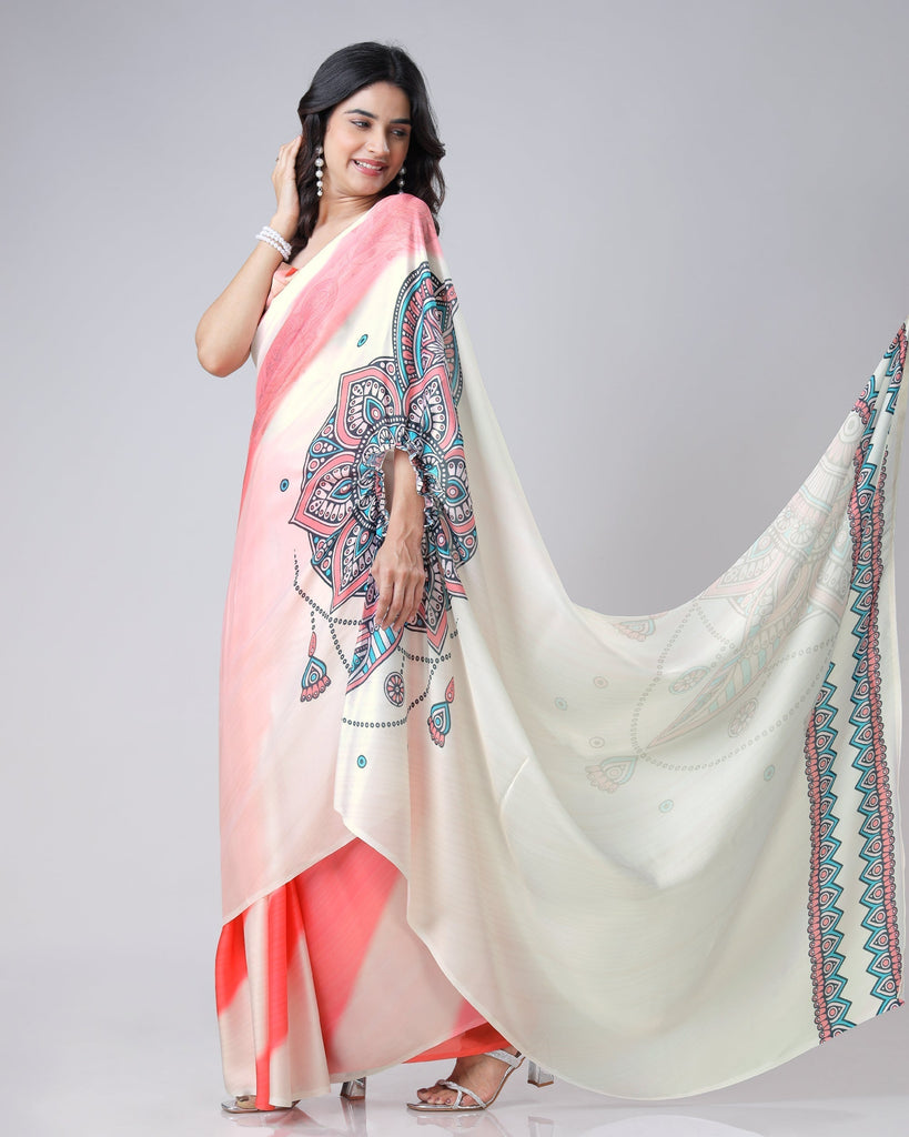Coral Cream Mandala Print Freehand Saree – Handsfree Draping Elegance
