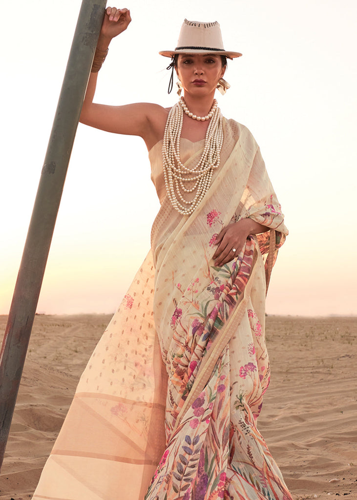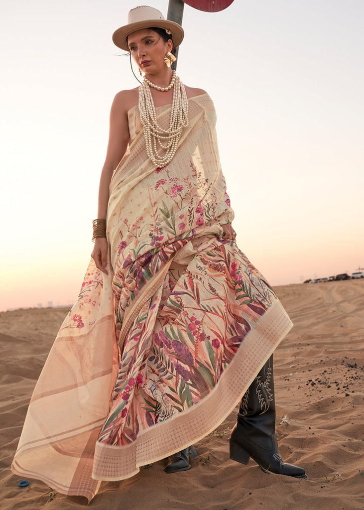 Cream Elegant Blended Linen Silk Saree – Breathable & Stylish for All Seasons