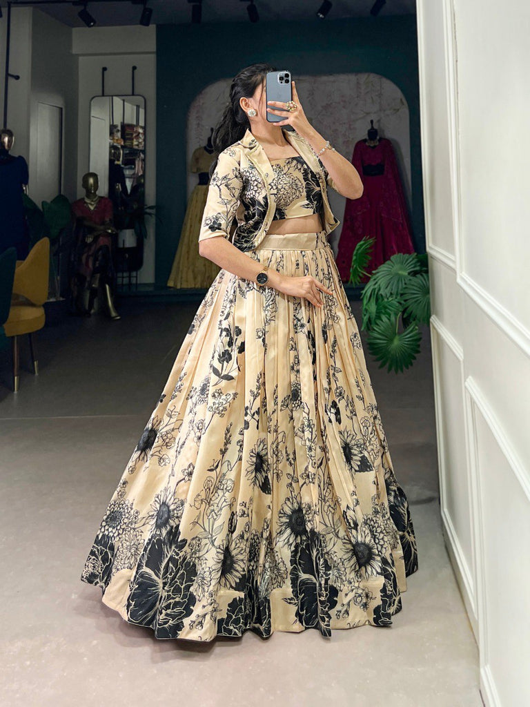 Cream Elegant Tussar Silk Floral Co-ord Set – Lehenga, Blouse & Koti