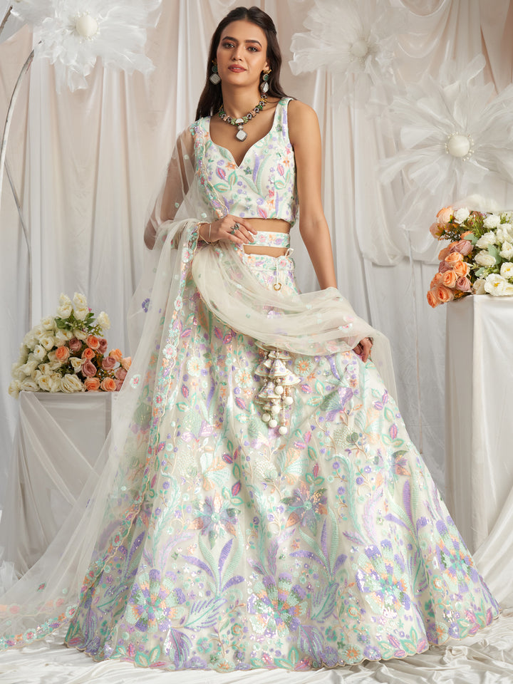 Cream Net Lehenga Set, intricately designed to capture attention at any celebration.premium cream net fabric with a full flared silhouette. It is beautifully embellished with multicolor sequins and fine coding thread embroidery, and finished with an elegant cutwork border along the hemline. Designed for a voluminous look, it includes a double Shantoon inner, two layers of Can Can
