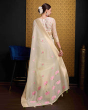 Cream floral printed saree, beautifully adorned with a shimmering zari border. Crafted from a soft cotton blend, this saree offers breathability and comfort while exuding festive charm. The delicate zari detailing enhances its traditional appeal, making it perfect for celebrations and special occasions.