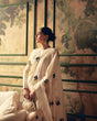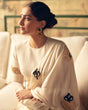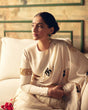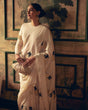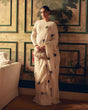 The saree features statement calligraphy-style black motifs printed across the body, contrasted beautifully with subtle gold circular accents, creating a blend of modern art and traditional charm. The serene cream base adds a soft, regal glow, making it ideal for women who love understated luxury.