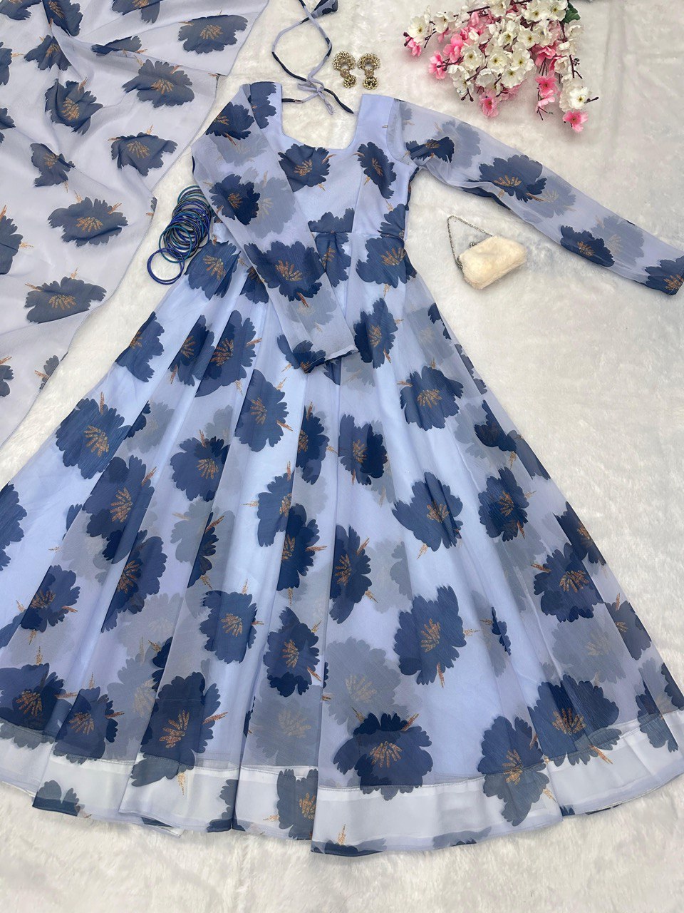 Dusty Blue Elegant Digital Print Anarkali Gown with Dupatta – A Perfect Blend of Tradition & Modernity