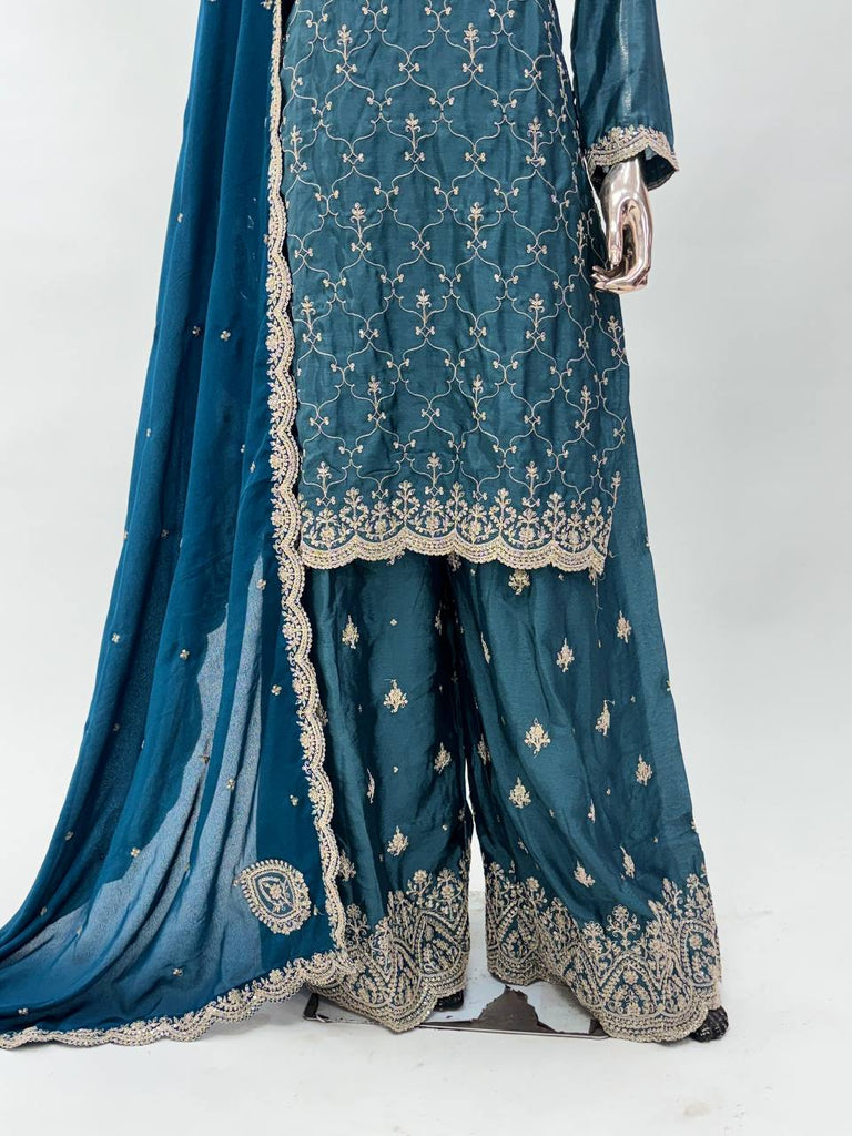 Dusty Blue Elegant Embroidered Chinon Suit Set – Full Stitched
